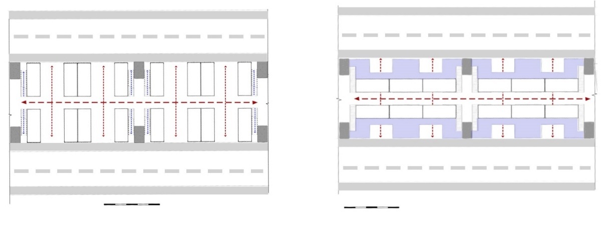 Đối với mỗi nhịp cầu từ 18 – 22 mét, bố trí một bãi đậu xe cho 3 – 5 khu ở, diện tích mỗi bãi đậu xe có thể bằng một nhịp cầu. Tại mặt tiếp giáp đường giao thông sẽ có hành lang nhỏ ngăn cách với đường giao thông bên ngoài, trồng cây xanh để cải thiện chất lượng không khí, cản bụi cho các ngôi nhà phía trong.