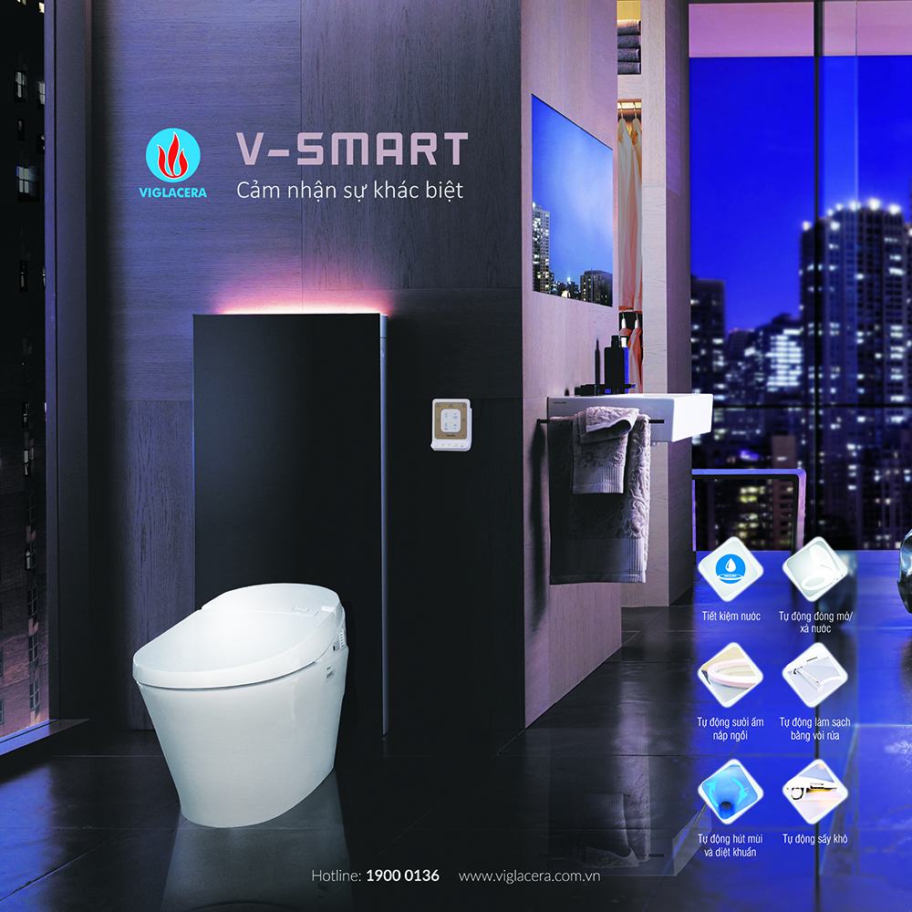 Thiết bị vệ sinh thông minh V-Smart V90 và V91 thuộc dòng sản phẩm cao cấp của Viglacera có đường nét thiết kế sang trọng, với đầy đủ các tính năng của dòng thiết bị vệ sinh thông minh thế hệ mới: Hệ thống cảm biến tích hợp vào nắp ngồi giúp nhận biết khi có người sử dụng và khởi động hệ thống tự động xả nước, tự động sấy khô và hút mùi, tự động đóng mở nắp, tự động diệt khuẩn nhờ lớp men phủ nano siêu mỏng trên bề mặt sứ… Bên cạnh đó, người sử dụng sẽ cảm thấy rất dễ chịu khi sử dụng nhờ có chức năng làm ấm nắp ngồi và điều chỉnh nhiệt độ vòi nước, cường độ và vị trí vòi rửa theo yêu cầu của từng cá nhân.