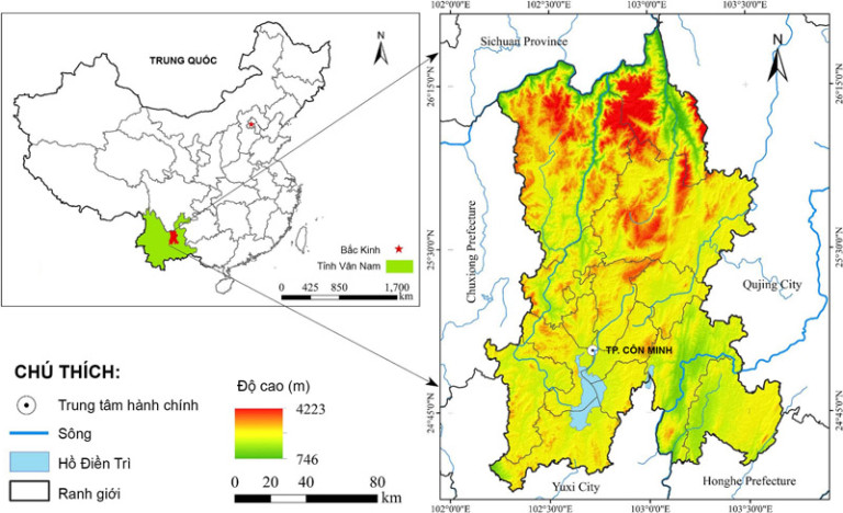 Côn Minh là TP nằm trên cao nguyên với độ cao trung bình khoảng 1.892 m so với mực nước biển, thuộc khu vực “karst” – bán khô hạn ở Tây Nam Trung Quốc, có địa hình thấp dần từ Bắc xuống Nam. Đặc điểm địa hình bị chia cắt mạnh khiến dòng chảy các con sông ngắn, độ dốc lớn và lưu lượng không ổn định theo mùa. Côn Minh có diện tích 21.012,53 km2, dân số khoảng 6,73 triệu người, là TP đông dân và phát triển kinh tế nhất tỉnh Vân Nam. TP nằm trong vùng khí hậu cận nhiệt đới gió mùa, với nhiệt độ trung bình năm khoảng 15,5°C và lượng mưa trung bình vào từ 1.000 – 1.500mm. Khí hậu ẩm ướt vào mùa hè, khô ráo vào mùa đông tạo điều kiện thuận lợi cho sự phát triển quanh năm của thảm thực vật cận nhiệt đới, giúp Côn Minh được mệnh danh là “TP mùa xuân” và “TP hoa”. Tuy nhiên, quá trình đô thị hoá nhanh chóng cùng với tác động của biến đổi khí hậu đã dẫn đến hiện tượng xói mòn đất và ô nhiễm môi trường nước ngày càng nghiêm trọng. Hồ Điền Trì với diện tích khoảng 340km², là hồ nước ngọt lớn nhất tỉnh Vân Nam và lớn thứ sáu của Trung Quốc, đóng vai trò quan trọng trong điều tiết thủy văn, cải thiện vi khí hậu, bảo tồn đa dạng sinh học, cung cấp nước sinh hoạt, sản xuất và tưới tiêu nông nghiệp cho toàn vùng. Tính đến năm 2021, TP Côn Minh có khoảng 624,52km2 đất ngập nước, với tỷ lệ bảo vệ đạt 69,43% [3, 7].