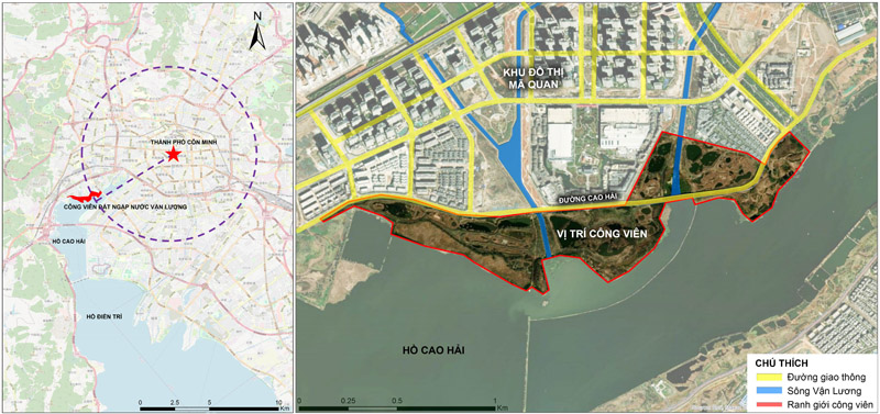 Thành phố (TP) Côn Minh thuộc tỉnh Vân Nam (Trung Quốc), là một đô thị có hệ sinh thái đặc thù với hồ tự nhiên và hệ thống sông ngòi phong phú. Trong đó, sông Vận Lương là một dòng sông quan trọng, đóng vai trò cung cấp nguồn nước cho hồ Điền Trì (thuộc lưu vực Điền Trì – một phần của hệ thống lưu vực sông Dương Tử) [4]. Trong những năm gần đây, quá trình đô thị hóa diễn ra nhanh chóng đã khiến khu vực này đang chịu áp lực lớn từ ô nhiễm nguồn nước, suy giảm chức năng sinh thái và thiếu hụt không gian xanh công cộng. Việc thiết kế công viên đất ngập nước tại khu vực hạ nguồn sông Vận Lương không chỉ là giải pháp kiến tạo cảnh quan và cải thiện môi trường khu vực, mà còn hướng tới xây dựng một mô hình không gian công cộng bền vững, kết hợp hài hòa giữa phục hồi hệ sinh thái và giáo dục môi trường, phù hợp với định hướng phát triển cảnh quan đô thị gắn kết với tự nhiên [5].