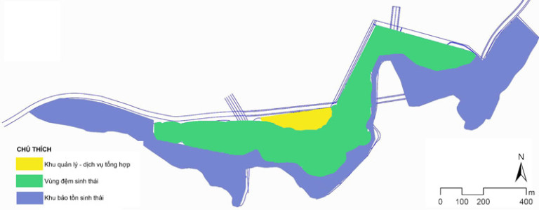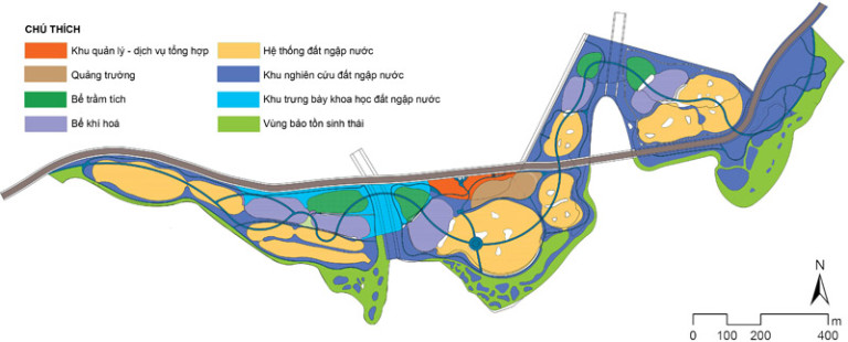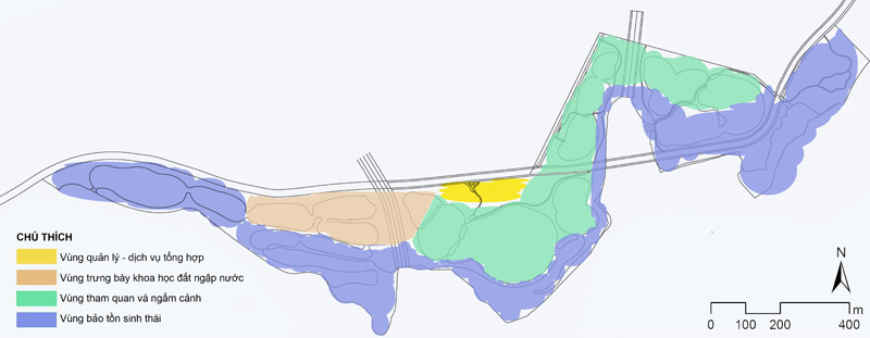 Theo hướng dẫn thiết kế công viên đất ngập nước đô thị (Design Guidelines for Urban Wetland Parks) [1], việc thiết kế cảnh quan công viên đất ngập nước cần được tổ chức thành ít nhất ba khu chức năng, bao gồm 3 khu: