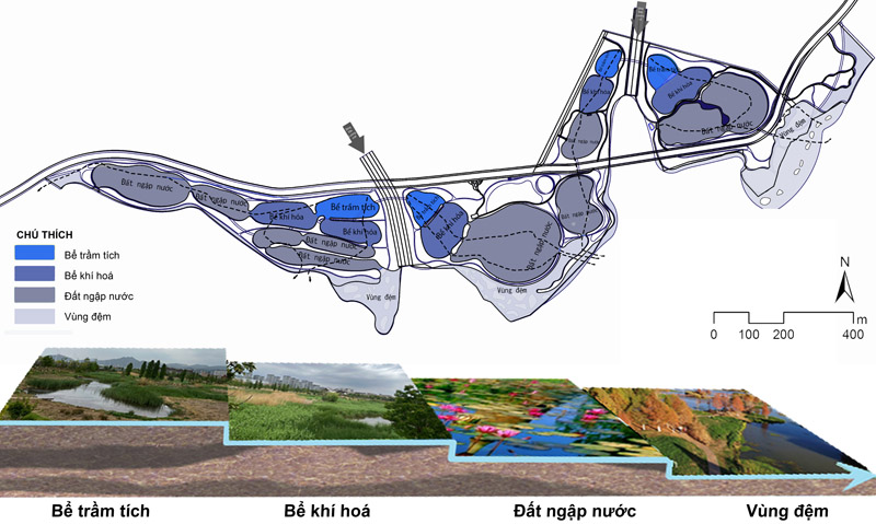 Bể trầm tích → Bể khí hóa → Hệ thống đất ngập nước → Vùng đệm