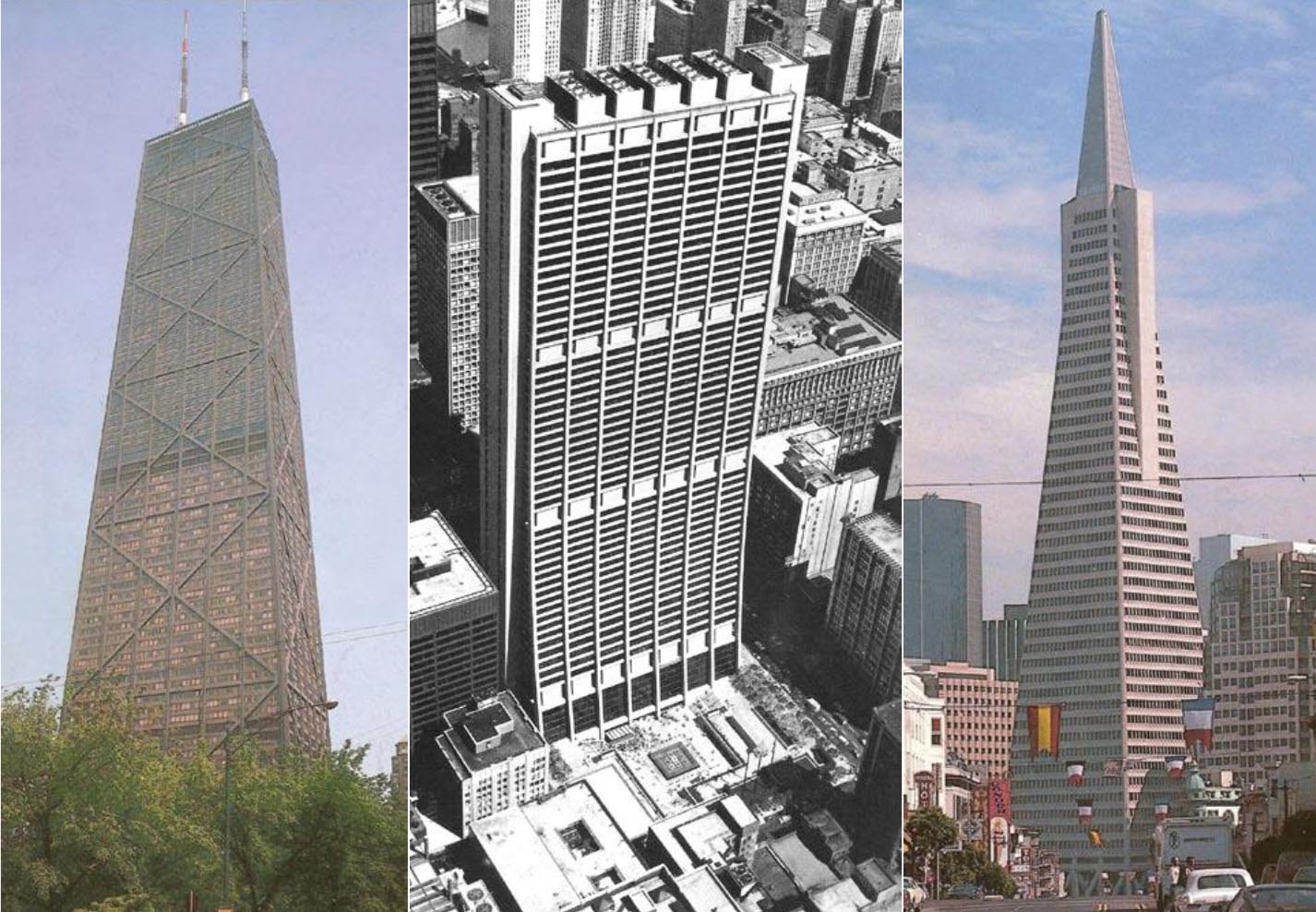 Các tòa nhà tháp John Hancock Chicago, Tháp Chase Chicago và Kim tự tháp Transamerica San Francisco (Hình 6) là ví dụ về việc thiết kế khí động hóa tòa nhà với hiệu ứng “giật cấp nhỏ dần” bằng cách tạo các tiết diện nhỏ dần của khối nhà dọc theo chiều cao và do đó giảm thiểu tải trọng gió và giảm gia tốc các luồng gió thổi từ trên cao xuống mặt đất ở bề mặt tòa nhà.