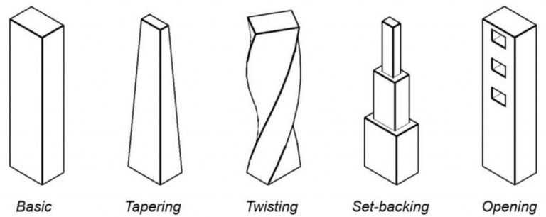 Giải pháp khí động học ở mức độ tổng thể bằng cách sử dụng thiết kế dạng hình nón, giật cấp nhỏ dần, xoắn ốc và đưa các khoang mở vào một tòa nhà cao tầng được coi là phương pháp hiệu quả trong việc giảm mô men lực cơ sở trong cả hai hướng trực giao do làm suy yếu sự phát triển của dòng xoáy không khí. (Hình 4)