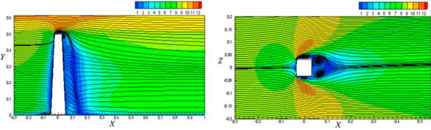 Hình dưới đây mô tả dòng chảy của luồng không khí xung quanh tòa nhà hình nón trong các mặt phẳng thẳng đứng và nằm ngang (ở độ cao 2/3 tòa nhà) thu được từ phân tích CFD . Các mô hình tòa nhà có hình dạng thuôn nhỏ dần và giật cấp nhỏ dần làm giảm lực cản, triệt tiêu áp lực gió ngang và làm giảm gia tốc các dòng khí chuyển động xuống chân tháp do đặc điểm hình học của chúng.