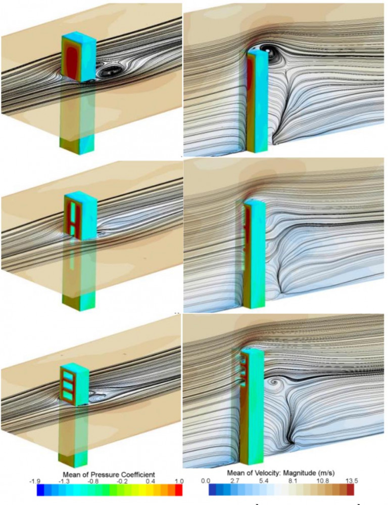 - Việc mở mặt tiền đạt được sự giảm thiểu gia tốc gió theo chiều ngang và làm gián đoạn các dòng xoáy dọc theo chiều cao tòa nhà.