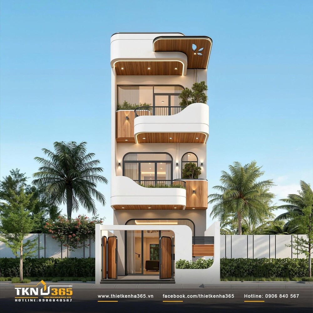 Nhà phố 4 tầng 5x15m tại Bình Phước: Công trình gây ấn tượng với mặt tiền uốn cong mềm mại, tựa như một dải lụa. Thiết kế này không chỉ tạo điểm nhấn thị giác mà còn giúp công trình trở nên nhẹ nhàng, uyển chuyển giữa khu phố.
