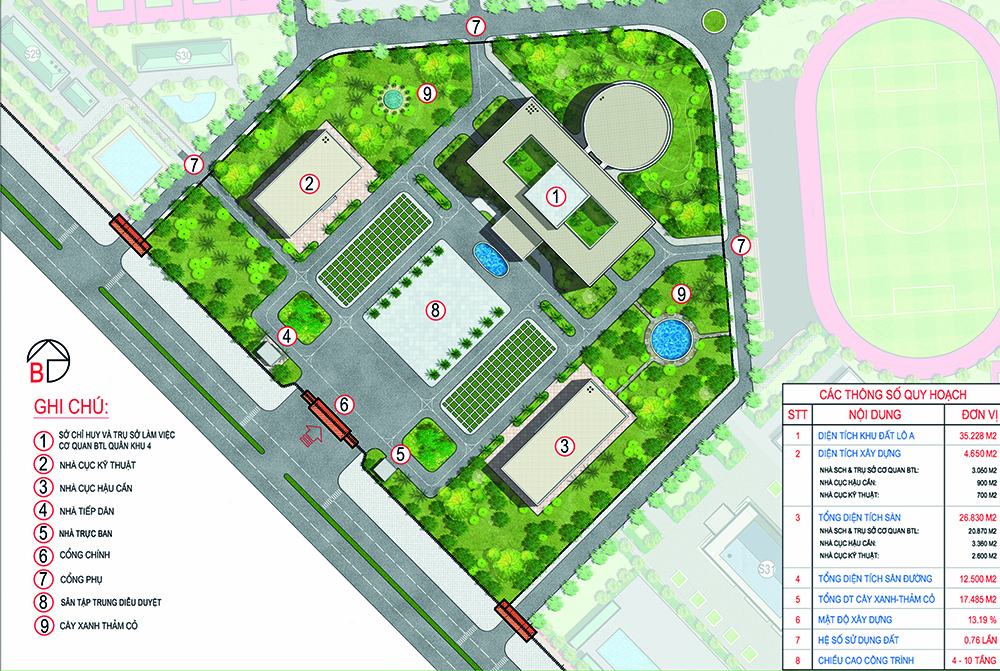 Khu vực này là nơi diễn ra các hoạt động thể thao, tập luyện điều lệnh với quy mô toàn đơn vị hoặc nhỏ hơn mà khu sinh hoạt và làm việc không bố trí. Bố trí nơi địa hình thuận tiện cho hoạt động tập luyện của bộ đội, chú ý hướng nắng, hướng gió với từng môn thể thao. Các hoạt động thể thao như sân cầu lông, bóng chuyền, tập xà… có thể bố trí đan xen trong các khu sinh hoạt. Trong khu vực sân vận động, huấn luyện điều lệnh bố trí khán đài và đường diễu duyệt phục vụ hội thao, duyệt đội ngũ của toàn đơn vị. Phần đất còn lại bố trí các dải cây xanh cách ly tiếng ồn đồng thời góp phần cải thiện vi khí hậu khu vực, che nắng, chắn gió bất lợi trong quá trình hoạt động thể thao.