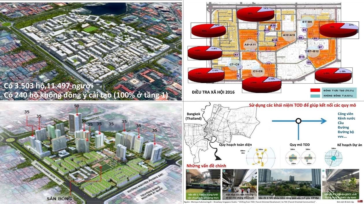 Vì vậy nên chẳng cần cách tiếp cận mới: chuyển từ cái nhìn nhỏ hẹp của các khu chung cư cũ mở rộng ra bên ngoài. Theo đó, sử dụng công cụ của TOD để kết nối các quy mô và mạng lưới liên kết. Chuyển mục tiêu lợi nhuận kinh doanh bất động sản sang mô hình TOC (cộng đồng định hướng giao thông ) để thu hút nguồn lực từ việc kết nối tổng thể lợi thế tự nhiên, kinh tế, văn hóa, xã hội… tạo nên sức mạnh mới trong phát triển.