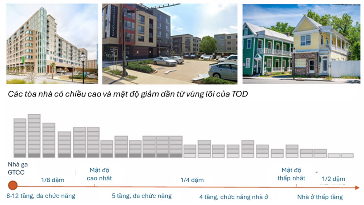 Một yếu tố quan trọng khác để mô hình TOD có thể thành công là mật độ xây dựng. Yếu tố này ảnh hưởng đến công suất vận chuyển hành khách của giao thông công cộng, và liên quan đến các cơ chế thu hồi giá trị từ đất đai (Land Value Capture, LVC). Nguyên tắc chung là càng gần đầu mối giao thông, mật độ xây dựng càng cao (Hình 4).
