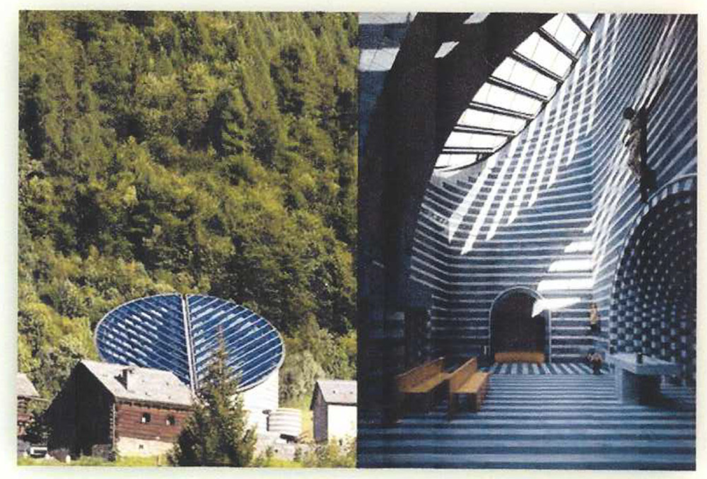 Một ngôi nhà nữa được xây dựng những năm 1996 – 1998 tại Valle Maggia ở Thụy Sĩ – Đó là Nhà thờ San Giovanni Battista. Hai sơ phác của ông về mặt cắt dọc và mặt cắt ngang (Hình 11a, b) cho ta thấy ý đồ của tác giả muốn qua ánh sáng của lỗ cửa hình tròn khổng lồ tạo nên vẻ huyền ảo của không gian nội thất. Các ảnh 12a, b cho ta thấy phía bên ngoài của vòng tròn nghiêng và ánh sáng qua đó vào nội thất như thế nào. Chúng ta thấy ở đây Mario Botta cũng thực hiện tư tưởng của Le Corbusier: “Ánh sáng là vật liệu của kiến trúc”.