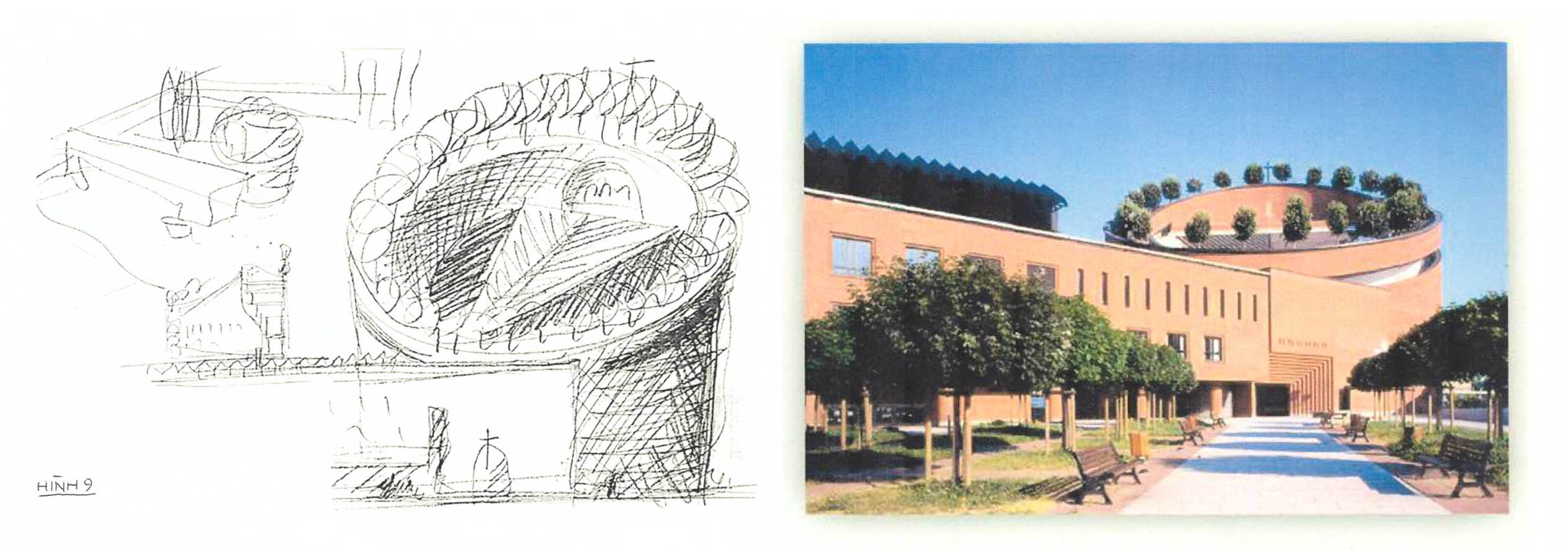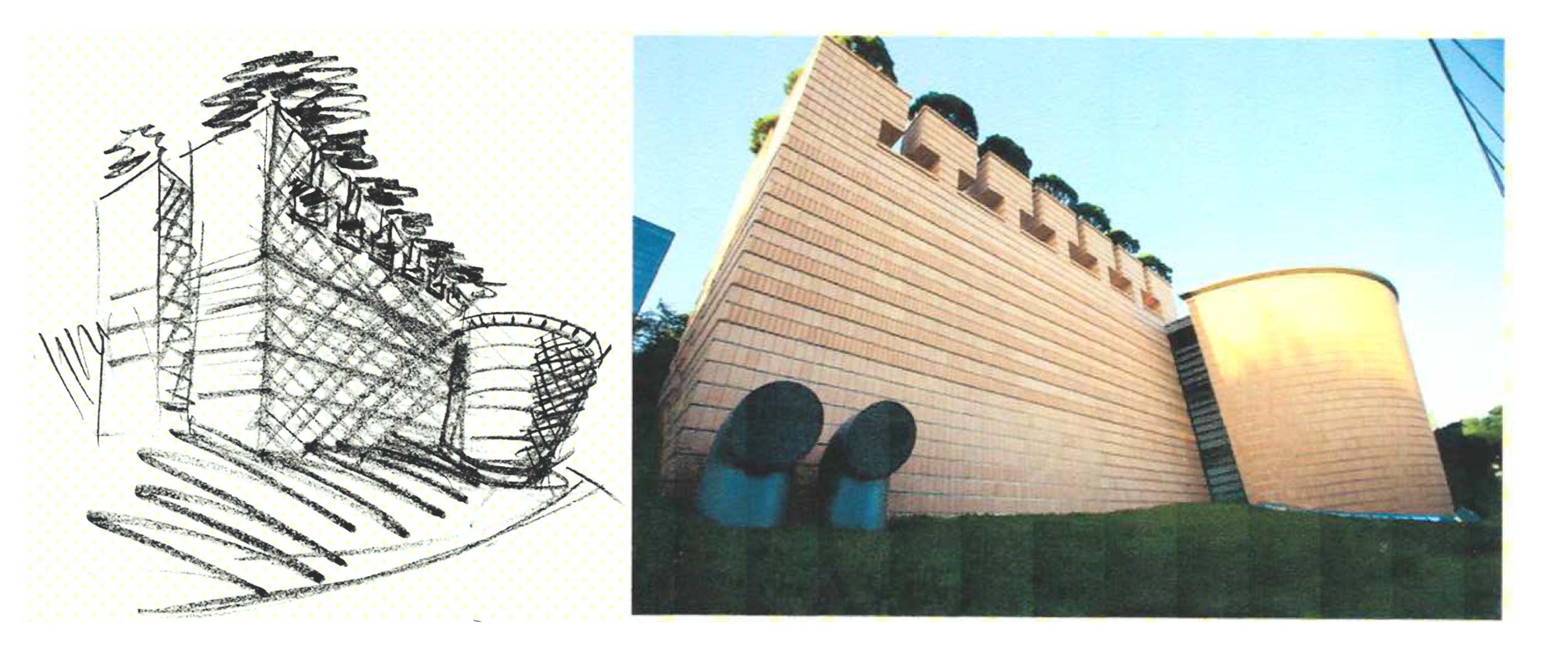 Hình sơ phác phối cảnh (Hình 5) cũng cho ta thấy hoàn toàn đúng như công trình đã xây dựng (Hình 6). Hình sơ phác mặt cắt cho ta biết tác dụng của cái vòng nghiêng khổng lồ là để lấy ánh sáng vào các tầng trưng bày (Hình 7). (Hình 8) là ảnh thực tế công trình đã xây dựng.