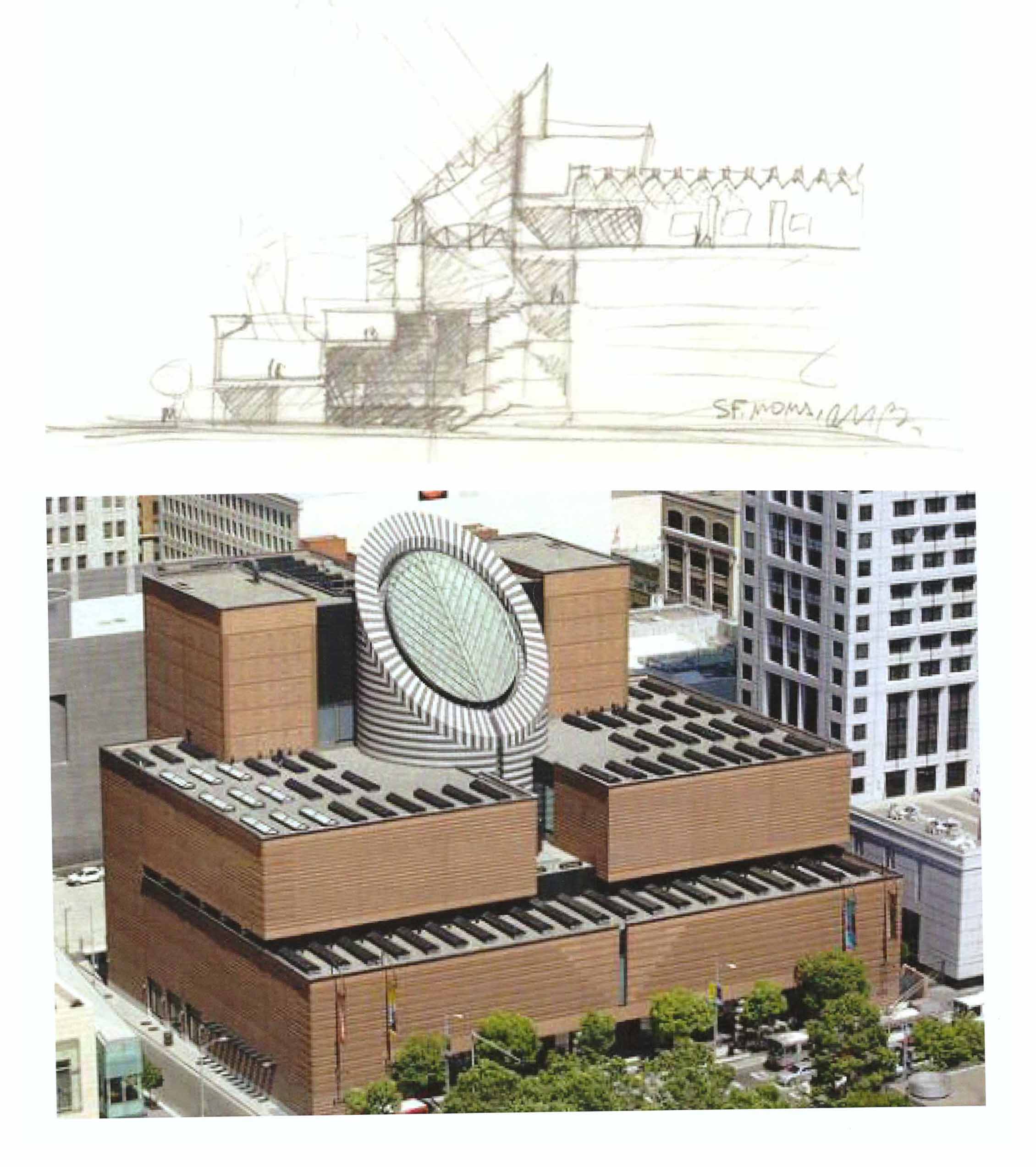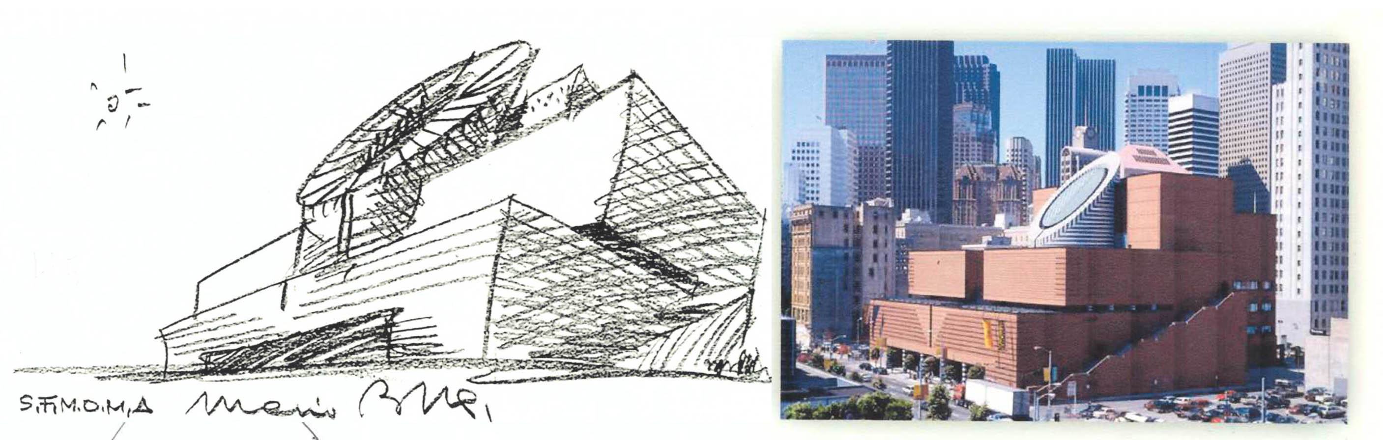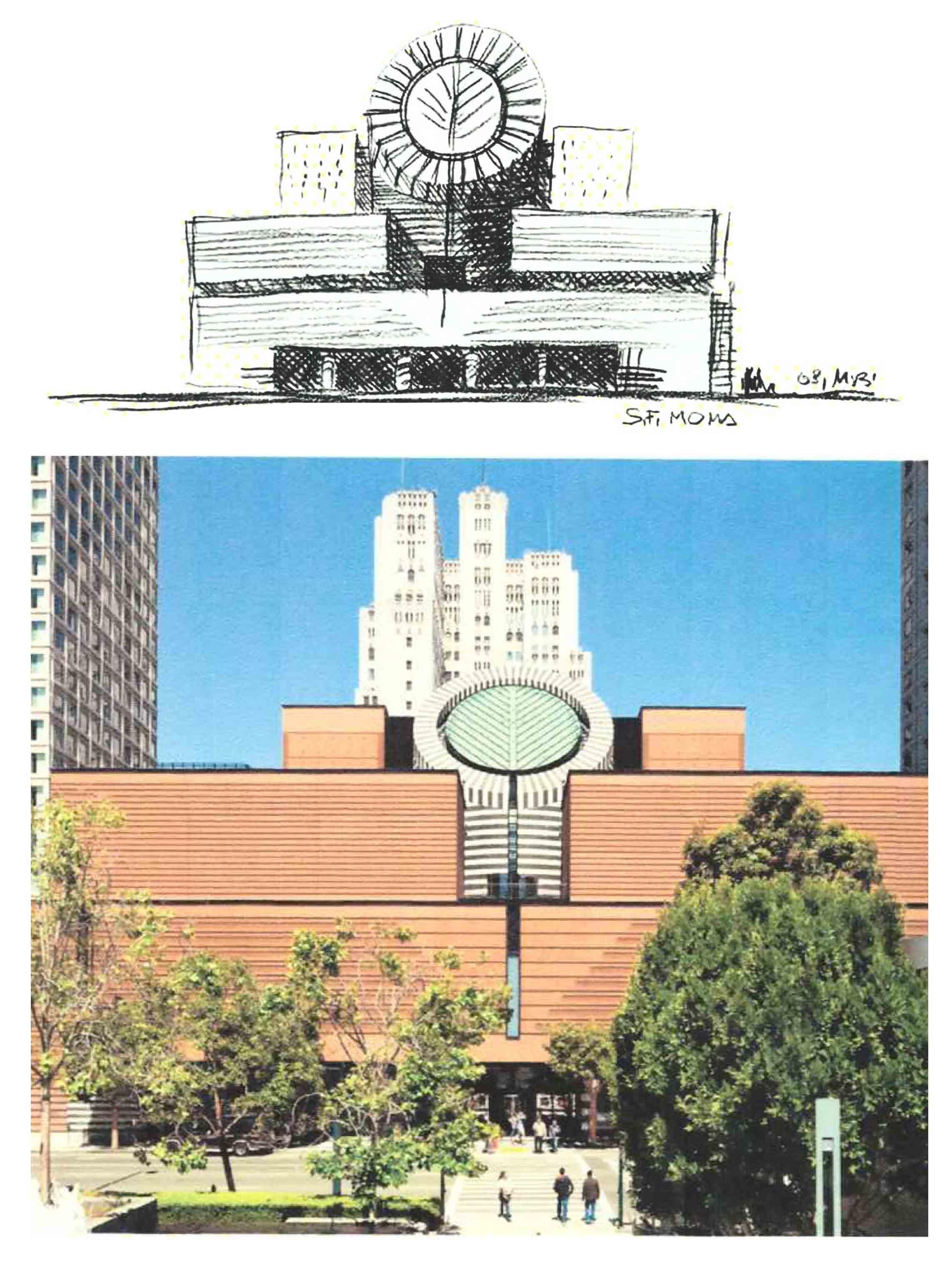 Năm 1989 – 1995, Mario Botta thiết kế Bảo tàng Nghệ thuật hiện đại tại San Francisco (Hoa Kỳ). Đây là một công trình lớn với diện tích 225.000 m2 và sau này đã mở rộng thành 450.000 m2. Bảo tàng có tên SF Moma. Đặc điểm quan trọng nhất và nổi bật nhất của công trình này là một khối kiến trúc lớn hình tròn đặt nghiêng. Với hình khối một mặt tròn nghiêng to lớn làm cho công trình nổi bật một cách khác thường trong cảnh quan đô thị, trở thành một điểm nhấn quan trọng của thành phố. Hình sơ phác mặt đứng (Hình 3) đã được thực hiện trong thức tế hoàn toàn đúng (Hình 4).