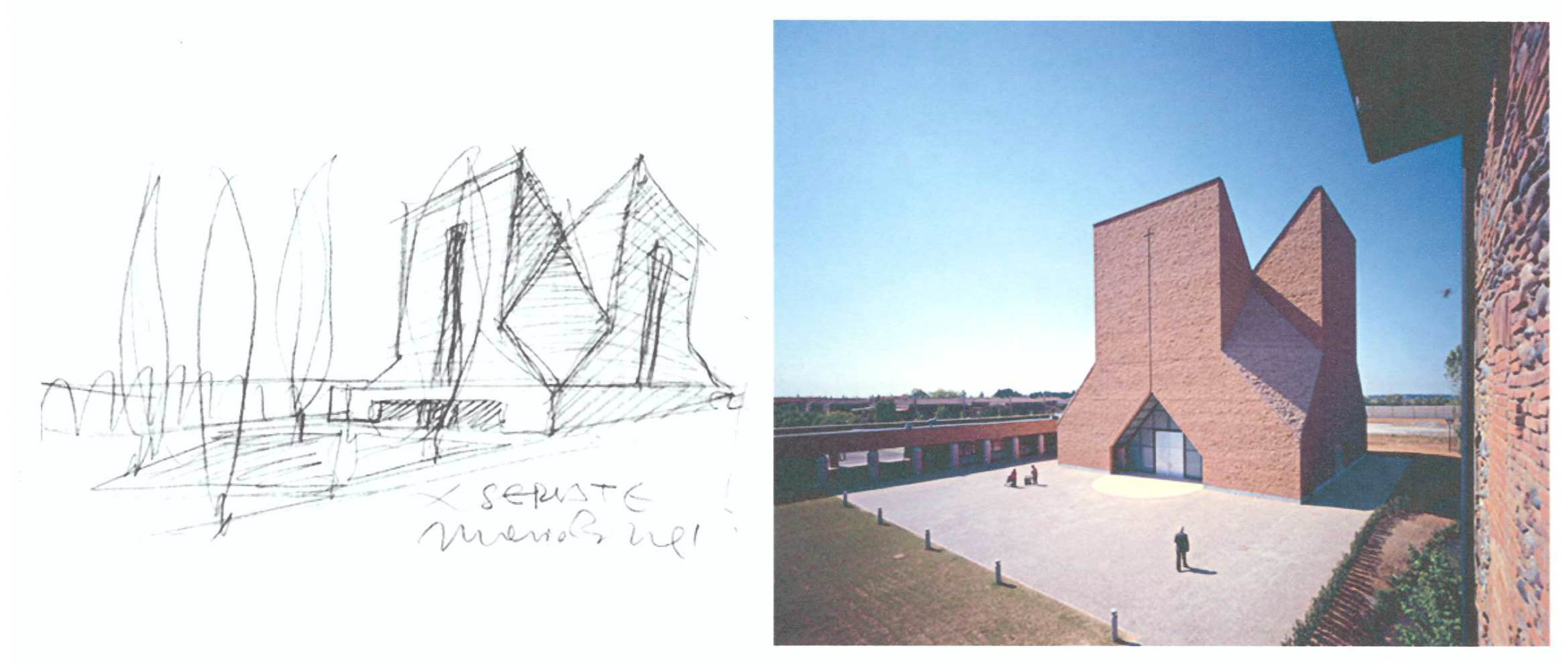 Từ năm 1994 đến 2004, Mario Botta thực hiện ở Italia một công trình với đường nét hình khối hoàn toàn khác hẳn những công trình trước đây. Đó là nhà thờ Pope Giovanni XXIII có diện tích 17.000 m2 đặt ở Paderno – Seriate tỉnh Bergano, Italia. Hình 19 là sơ phác, hình 20 là công trình. Với công trình này ta thấy Botta đã tiến tới gần với nghệ thuật tạo hình, hình khối chắc khỏe, mạch lạc, rất ấn tượng.