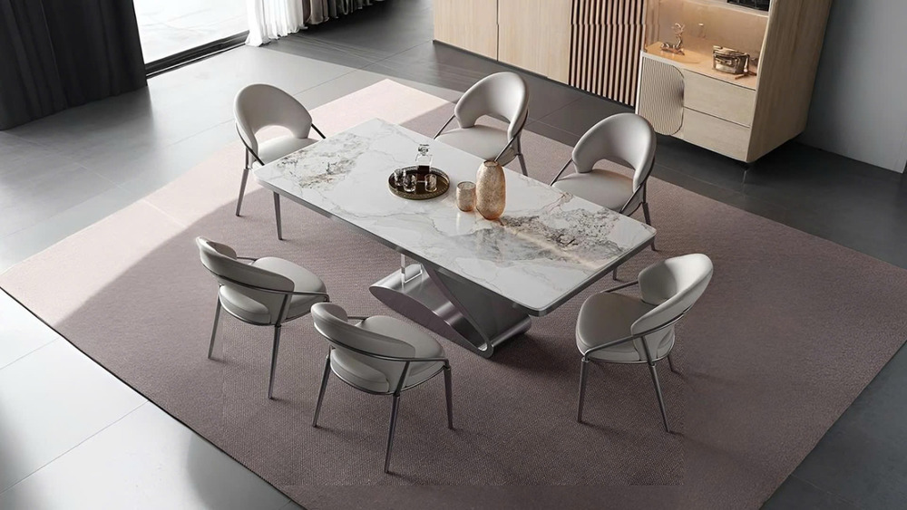 Không gian ẩm thực tiếp tục phản ánh tinh thần tích hợp thông qua các bộ bàn ghế ăn đồng bộ về kết cấu và ngôn ngữ thiết kế. Các mẫu bàn ăn sử dụng bề mặt đá hoặc vật liệu chịu lực cao, đảm bảo khả năng chống trầy xước và duy trì vẻ ổn định theo thời gian. Trong khi đó, bàn ăn gấp gọn được phát triển với hệ cơ cấu mở rộng chắc chắn, giúp thay đổi công năng mà không làm suy giảm tính thẩm mỹ.