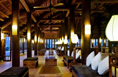 Ancient Hue Garden House (Huế) sử dụng kiến trúc cung đình Huế kết hợp các chi tiết, họa tiết và hoa văn, màu sắc cung đình, đồ decor trang trí, vật liệu gỗ chạm khắc tinh tế
