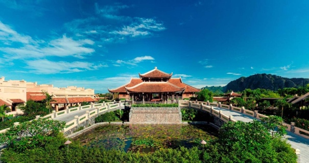 Emeralda resort, (Ninh Bình) thiết kế theo phong cách làng quê Bắc Bộ truyền thống với nhà ngói đỏ, cổng gỗ và tường gạch cổ