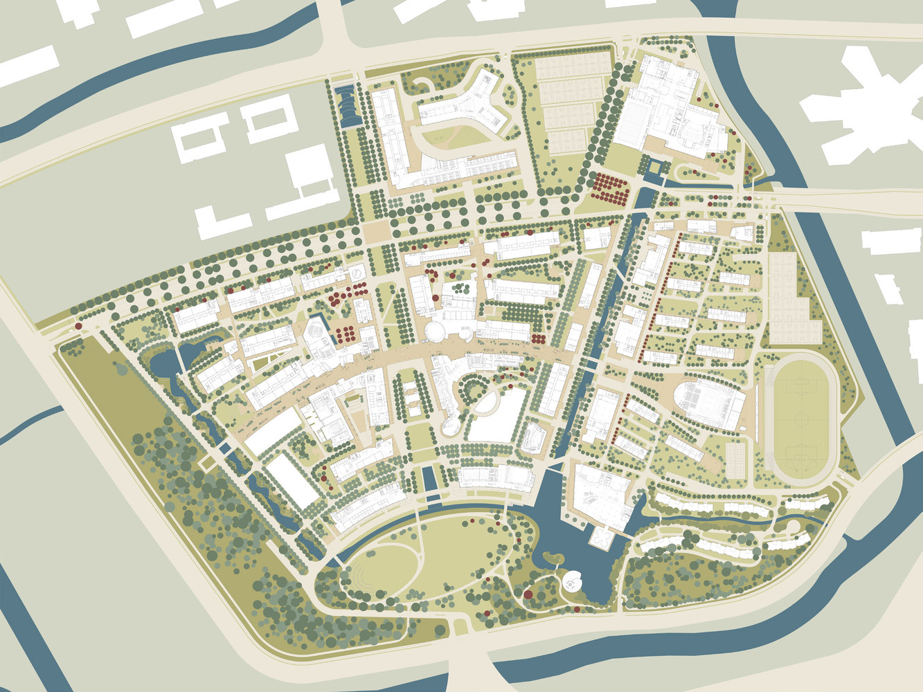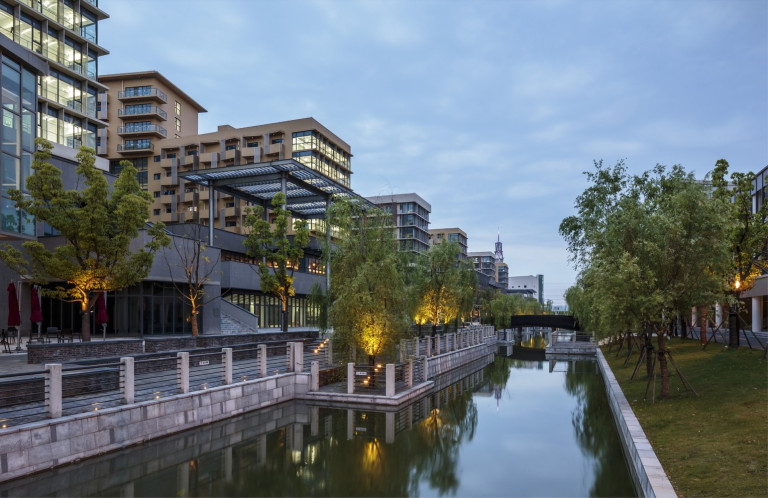 Được chọn là dự án giành chiến thắng trong cuộc thi quốc tế, dự án tổng thể được xem như là một mẫu thử mới của thiết kế trường ở Trung Quốc – một chương trình thúc đẩy sự tham gia của giảng viên và sinh viên qua các lĩnh vực khuyến khích đổi mới khoa học và thành tựu kinh doanh. Các cơ sở công nghệ lân cận và hệ thống kênh rạch xung quanh đã tạo ra một môi trường học tập sáng tạo, bắt nguồn từ bối cảnh của nó. Với hình dáng trăng lưỡi liềm, dự án liên kết các cơ sở hành chính, giáo dục và thư viện, mặt tiền đường vào phía nam của trường và công viên trung tâm Great Lawn. Mở rộng về hướng bắc từ bãi cỏ là ba trục của các tuyến cảnh quan khác nhau – mỗi một tuyến “xanh” định nghĩa khuôn viên của ba khu phố chính. Năm trường học và một trung tâm giáo dục tọa lạc chặt chẽ dọc theo trung tâm nghiên cứu tứ giác khuyến khích sự trao đổi và các hoạt động liên ngành. Bốn trong số các trường học, Vườn ươm và Khu dân cư, Thư viện, một lối đi dạo chơi nhiều lối đi cong cong, được kết nối với khuôn viên trường.