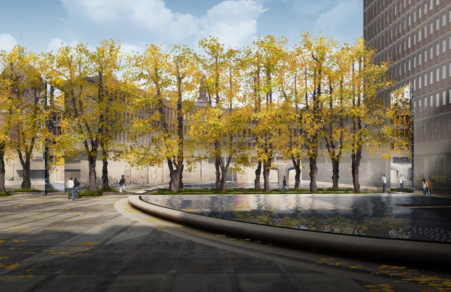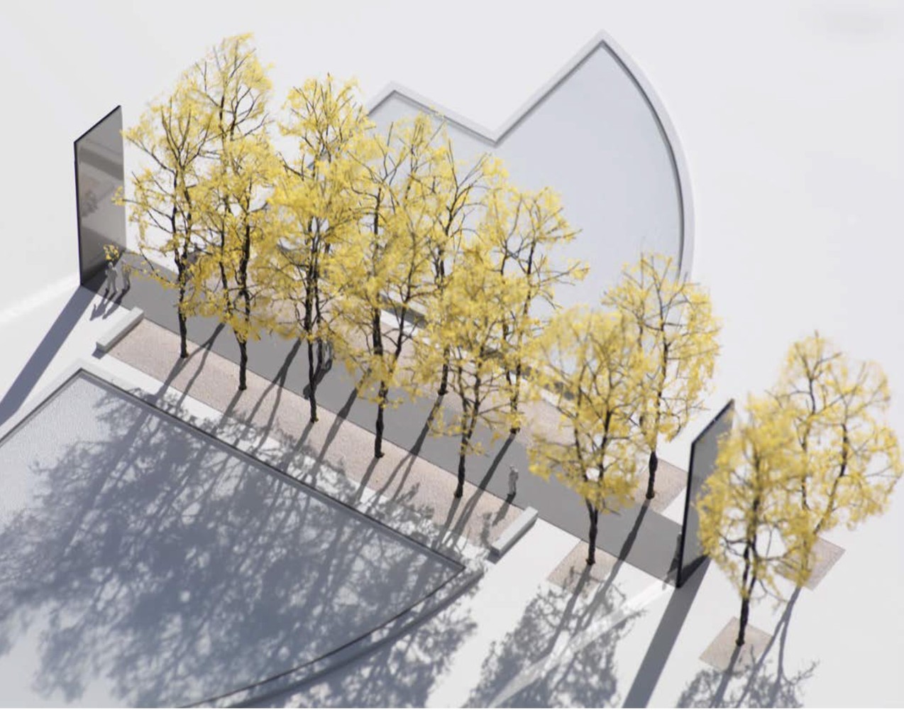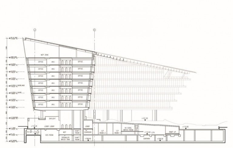 Yêu cầu cụ thể của khách hàng đòi hỏi một chiều cao nhất định và một địa hình dốc cụ thể. Các nguyên tắc thiết kế cũng điều chỉnh theo mức tối thiểu của các nhu cầu trên. Thiết kế tiếp cận các nguyên tắc này để đáp ứng các yêu cầu về khả năng sinh sống của cư dân với chất lượng sống cao như thể đó là một trụ sở địa phương. Kết quả là tòa nhà đạt đến độ cao 13 mét trên mặt đất. Không gian mở được trang trí theo phong cách tự nhiên, nở rộ. Lớp kính thủy tinh kim loại cho phép giữ được sự riêng tư trên những góc tiếp xúc với bên ngoài và mang lại vẻ khí động học hơn, trong khi kính rõ ràng được sử dụng ở các mặt cuối của mạn tàu, ở những độ cao và bao bọc dưới đáy của tàu tăng tối đa sự “quan sát” trong boong. Nhà hát sức chứa 100 người cần phải có một khu cao gấp đôi và được đặt ở các tầng cao hơn và ngay bên dưới không gian thuê của người thuê, trong cùng một khu vực đối với phòng trưng bày, hội nghị và trước buổi lễ tiện nghi. Có thể nhìn thấy qua tấm kính kim loại ở bên ngoài và nhìn thấy rõ ràng ra sân, đặc điểm này làm tòa nhà trở nên khác biệt, không bị coi hoàn toàn chỉ là một tòa nhà văn phòng. Kính màu kim loại bên ngoài cho phép bảo vệ tốt năng lượng mặt trời. Kính được cắt bỏ ở các cạnh thấp hơn và sử dụng một chiếc kính thủy tinh có độ kim loại thấp được sử dụng ở các mặt cuối của mạn, vào cao độ sân cũng như bao bọc dưới đáy của tàu, để giảm khẩu độ di chuyển, giảm năng lượng mặt trời tiếp xúc đến các tầng văn phòng. Ở vị trí mặt tiếp xúc và sân thượng được cung cấp thêm sắc xanh cây trồng, không chỉ bảo vệ những khu này từ năng lượng mặt trời mà còn buộc các tàu hòa vào cảnh quan bên dưới.