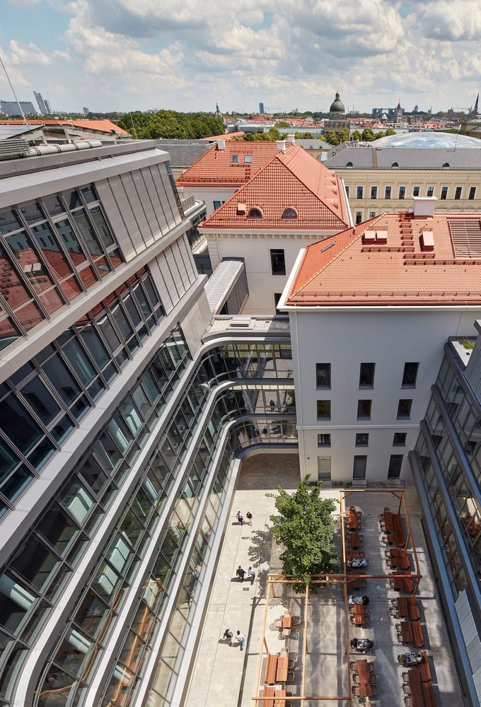 Trụ sở toàn cầu mới của Siemens có 1.200 nhân viên hỗ trợ đổi mới và chia sẻ tri thức trong toàn tổ chức thông qua một khu chung cư chung và khoảng sân trước, nơi mọi người có thể gặp gỡ và trò chuyện. Các văn phòng bao gồm các phòng mở, trong đó nhân viên có thể làm việc theo nguyên tắc, hoặc làm việc trong các khu yên tĩnh để tập trung cao độ. Tất cả các không gian làm việc đều có cửa sổ kính suốt từ trần đến sàn, và nhân viên có thể điều chỉnh hệ thống sưởi ấm và thông gió theo sở thích của họ. Nằm ở trung tâm Munich, Quảng trường Wittelsbacherplatz lịch sử có thể được nhìn thấy từ tòa nhà và nằm ở phía sau cung điện Ludwig Ferdinand Palais được cải tạo, cho đến năm 2016 có chính quyền của Siemens. Trụ sở của Siemens kết hợp kiến trúc đầy tham vọng với công nghệ xây dựng hiệu quả, giới thiệu một chuẩn mực cho tính bền vững của nghề nghiệp. Là một trong những trụ sở bền vững nhất ở châu Âu với chứng chỉ DGNB Platinum và LEED Platinum, 30.000 điểm dữ liệu từ công nghệ tiên tiến của Siemens được sử dụng để điều chỉnh nhiệt độ, thông gió và ánh sáng của tòa nhà. Tòa nhà tiêu thụ ít hơn 90% năng lượng và ít nước hơn 75% so với tòa nhà trước đây. Mặt tiền phía trong nghiêng góc 5 độ để tối ưu hóa ánh sáng cho tầng dưới, giảm sự phụ thuộc vào ánh sáng nhân tạo và chi phí hoạt động. Ngoài ra, một hệ thống nước ngầm làm mát được gắn vào một hệ thống địa nhiệt để tối ưu hóa khí hậu.
