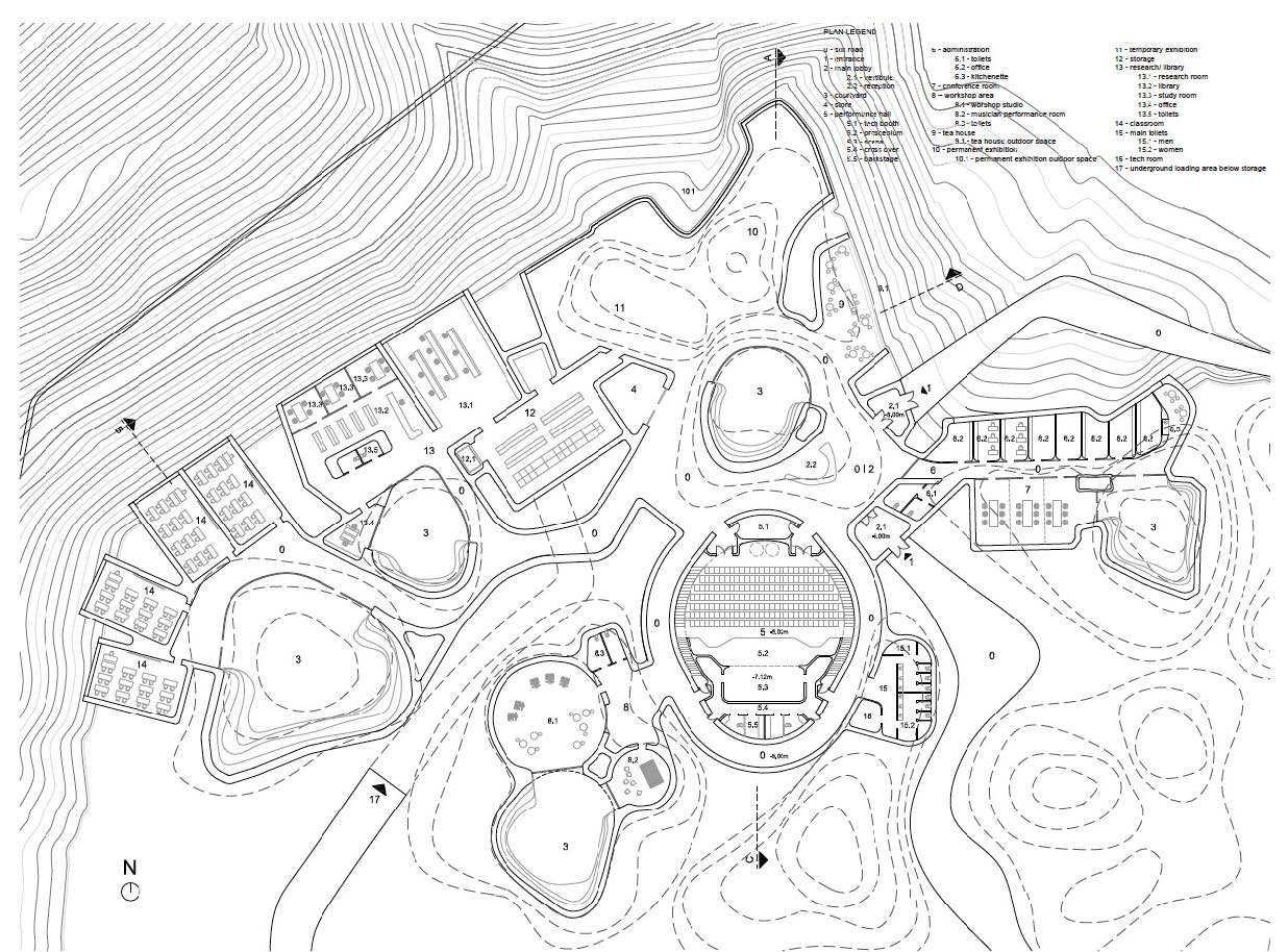 Đội ngũ thiết kế tập trung công việc của họ vào triết lý tạo ra một sự đột phá can thiệp tinh tế mà không ảnh hưởng đến trực quan mạnh mẽ của Thung lũng Bamiyan. Để bổ sung cho tác động trực quan này, họ đã rời mảnh đất này để tạo ra một vùng hoa tulip đỏ tượng trưng cho niềm tin của người dân thung lũng Bamiyan Valley nhưng lại tạo cho họ cơ hội thu nhập từ việc xuất khẩu hoa tulip đỏ thu hoạch từ địa hình của khu vực. Lấy cảm hứng từ những ngôi nhà trong hang động ở Thung lũng Bamiyan, trung tâm văn hóa được thiết kế để đào dưới lòng đất, đảm bảo rằng độ nhạy của địa hình vẫn còn nguyên vẹn mà không có cấu trúc mới, lạ lẫm hoặc không được chấp nhận làm gián đoạn các đặc tính của thung lũng. Một trong những ưu điểm về môi trường chính của việc khắc các không gian ngầm là giảm lượng khí thải cacbon trong không gian, vì vật liệu xây dựng duy nhất được sử dụng là những vật liệu đã có tại chỗ. Ngoài ra, một điểm quan trọng cần lưu ý trong thiết kế là sử dụng các lớp sân, giúp điều chỉnh nhiệt độ trong suốt thời gian thay đổi theo mùa. Những lớp ngầm này sẽ vẫn mát mẻ hơn vào mùa hè và ấm hơn vào mùa đông đảm bảo làm mát và làm mát thụ động tương ứng và giảm việc sử dụng điện cần thiết để làm mát hoặc sưởi ấm.