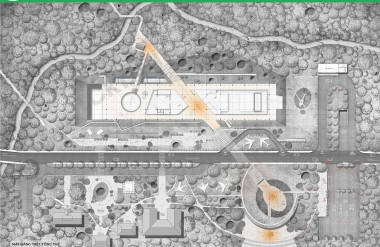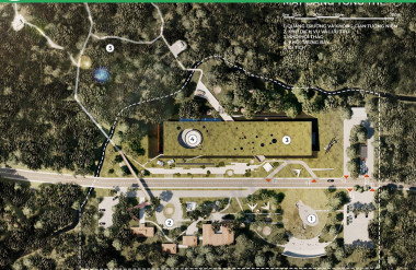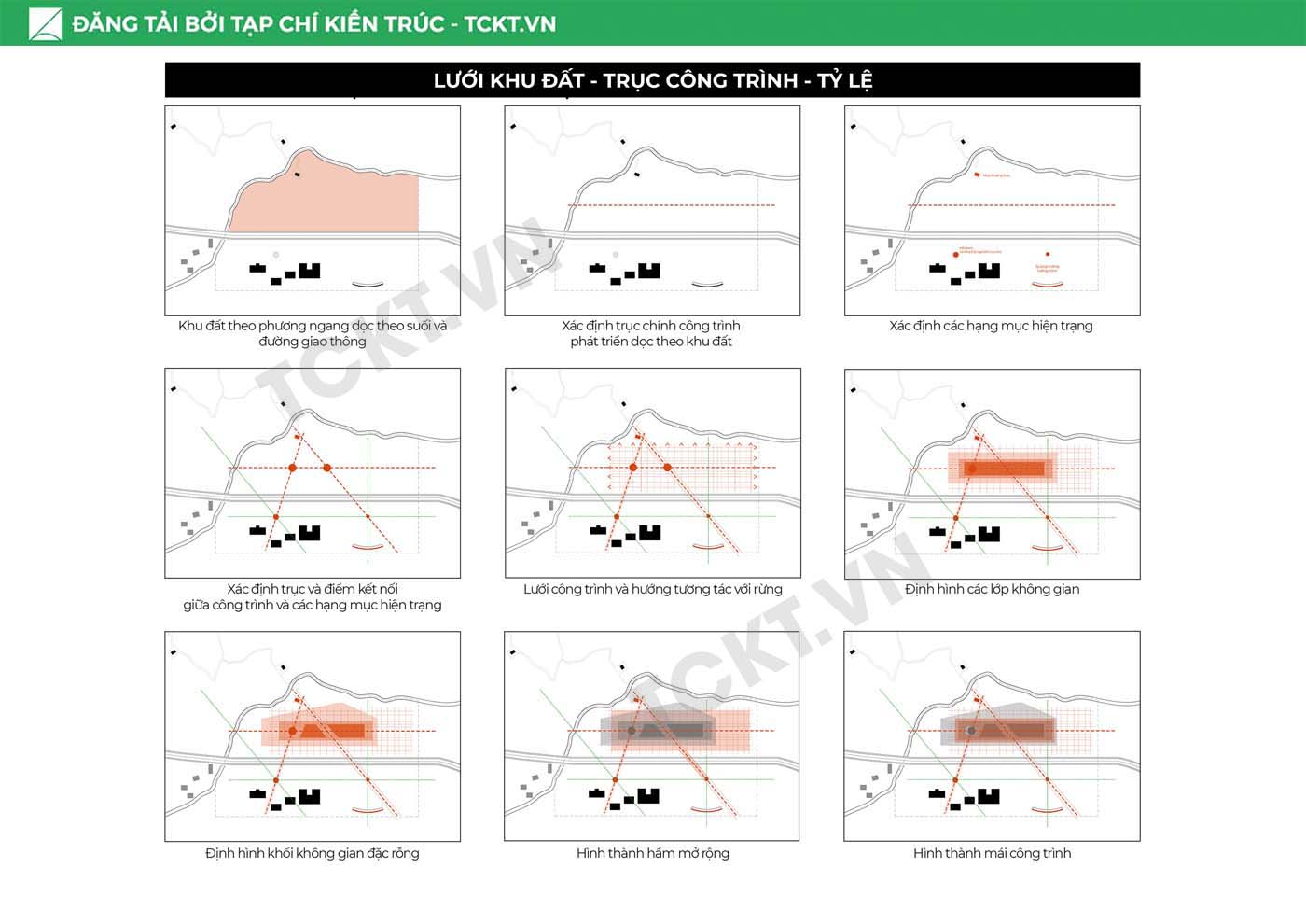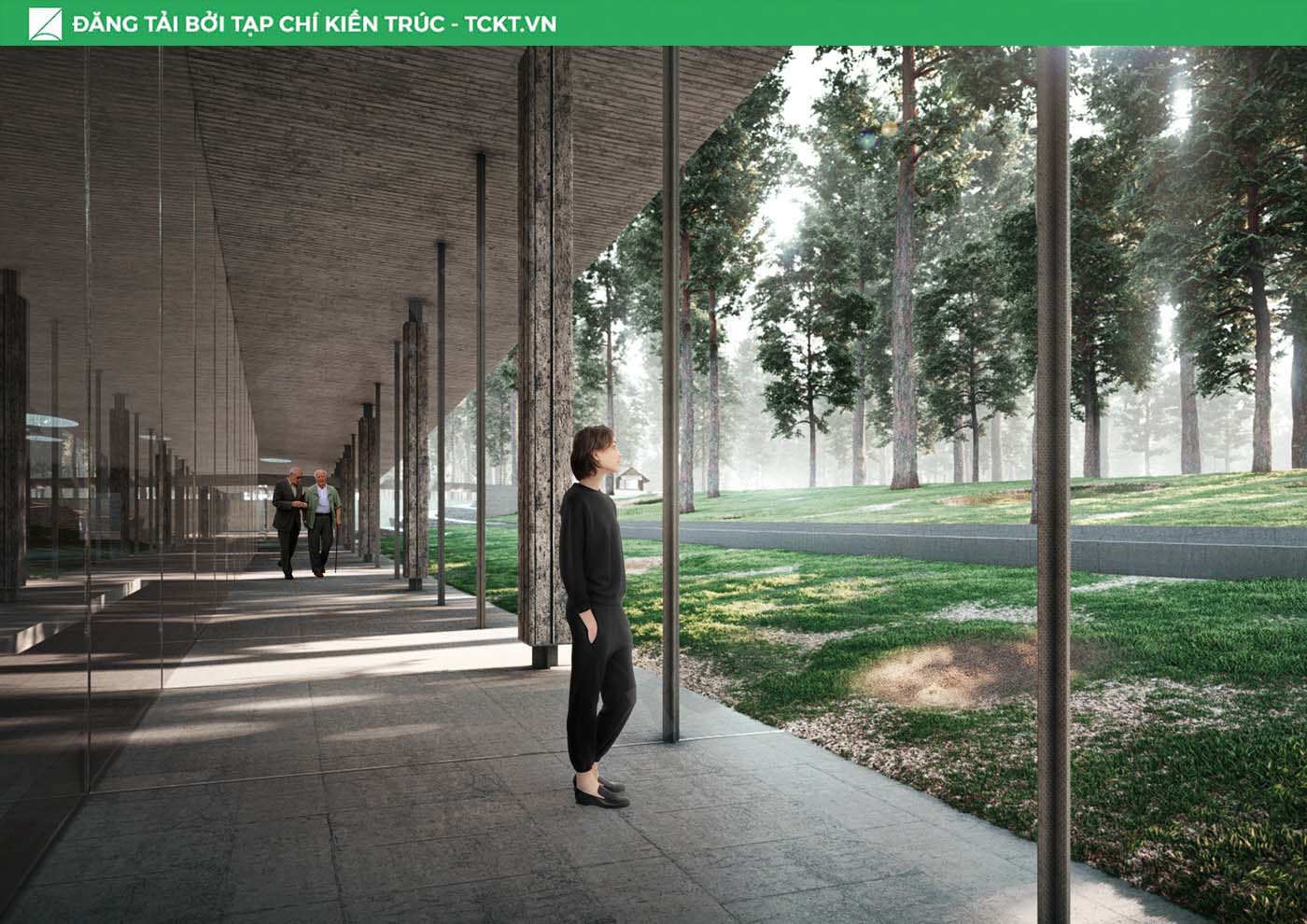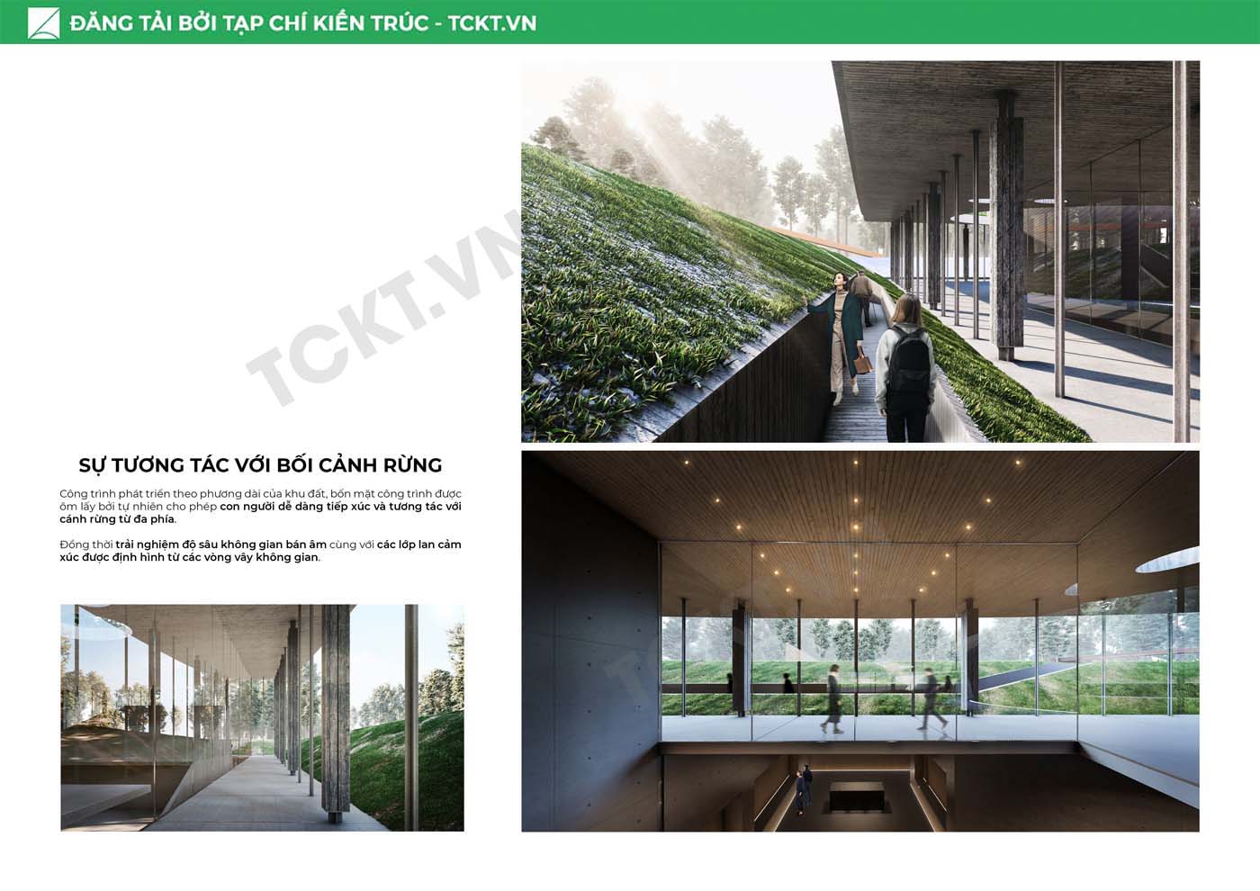 Công trình phát triển theo phương dài của khu đất, bốn mặt công trình được ôm lấy bởi tự nhiên cho phép con người dễ dàng tiếp xúc và tương tác với cánh rừng từ đa phía. Đồng thời trải nghiệm độ sâu không gian bán âm cùng với các lớp lan cảm xúc được định hình từ các vòng vây không gian.