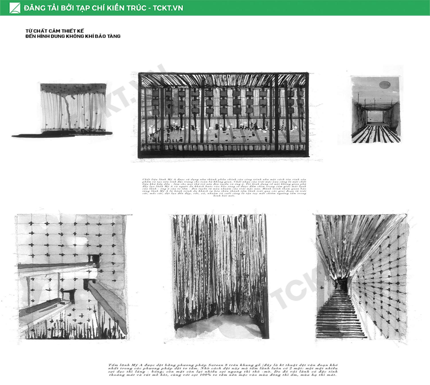 Nghĩ về lãnh, tôi nghĩ về một không gian gần gũi, tình cảm và sâu sắc; một không gian có tính tầm thước và nhất là phải hợp lí với cảnh quan thiên nhiên. Nhìn từ tổng thể bên ngoài, hình khối kiến trúc gợi nên chiều liên tưởng trừu tượng cuộn vải Lãnh trôi trên sông. Tuy nhiên, lối kiến trúc này cũng tạo nên sự bình lặng và chiều dài vô tận – tiếp diễn cho tương lai của lãnh Mỹ A. Toàn bộ nội thất công trình được phủ bởi lãnh Mỹ A không những tôn vinh màu sắc mà còn sử dụng đúng chất liệu lãnh – chất liệu tự nhiên hình thành nên tinh thần công trình.