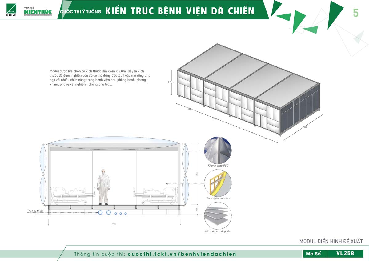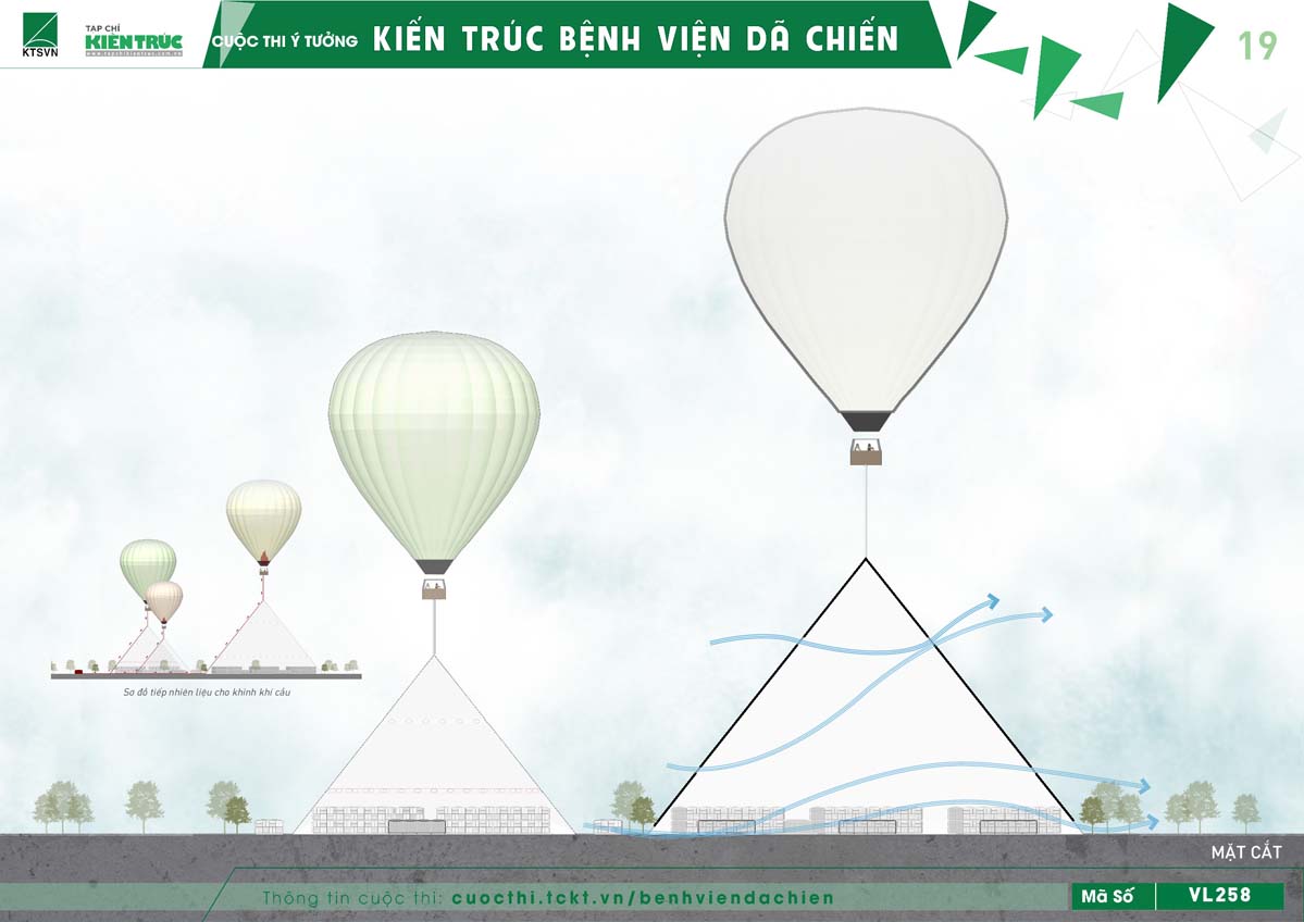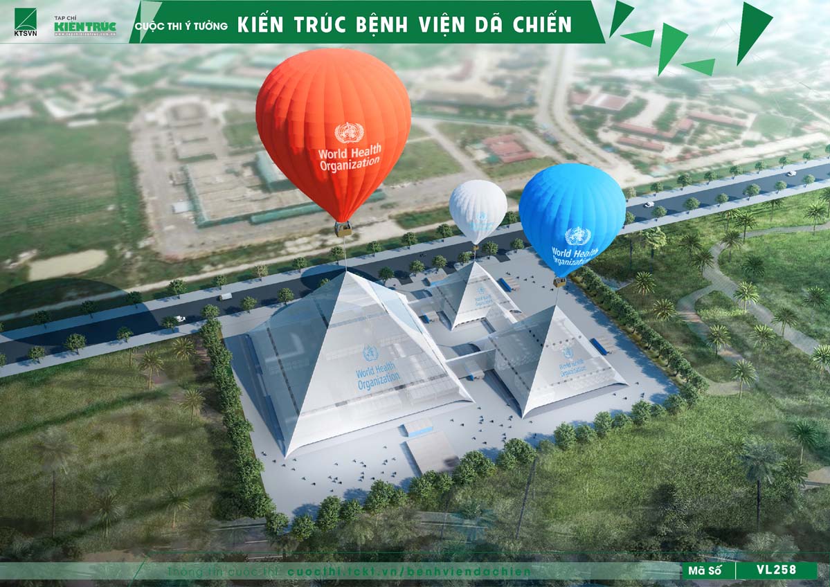 Bệnh viện dã chiến do các tác giả thiết kế được thu gọn trong 3 khối kim tự tháp, tương ứng với 3 zone (vùng) tham khảo từ hướng dẫn của WHO. Lớp vỏ bọc thân thiện được căng lên bởi khinh khí cầu dễ dàng được nhận diện từ rất xa, bất kể đêm hay ngày. Nhờ vậy, mọi người có thể nhận biết và giữ khoảng cách an toàn trong quá trình bệnh viện vận hành. Phần không gian chức năng bên trong được thiết kế mô-đun hóa, giúp dễ dàng vận chuyển, lắp ghép, xây dựng trên các địa hình khác nhau. Một mô-đun gồm phần khung thép, lớp màng căng ETFE được bơm khí và các tấm vách, sàn nhẹ. Lớp vỏ đệm khí ETFE giúp tận dụng ánh sáng tự nhiên và có khả năng cách nhiệt hiệu quả. Kết hợp với lớp bạt kim tự tháp, bệnh viện dã chiến hình thành 2 lớp vỏ ngăn vi khuẩn phát tán rộng ra bên ngoài.