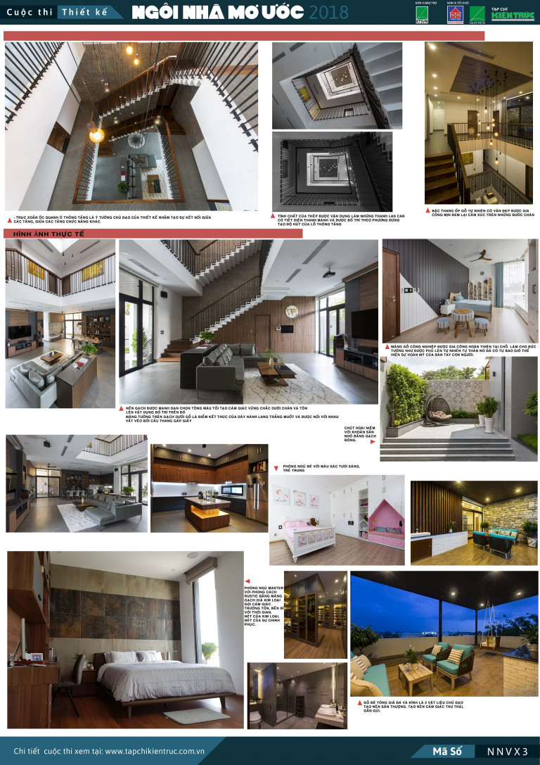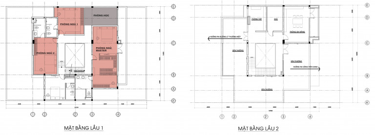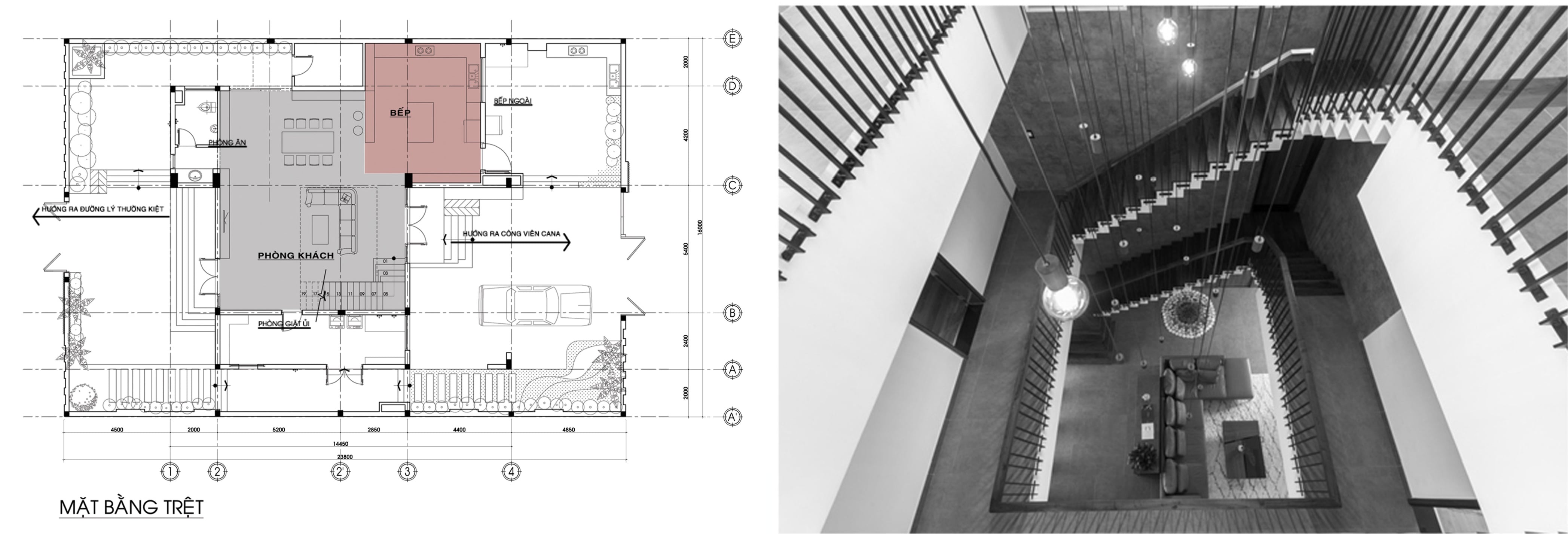Không gian kiến trúc lầu 1 là các phòng ngủ được kết nối với nhau bằng một vòng hành lang vuông quanh lỗ thông tầng.