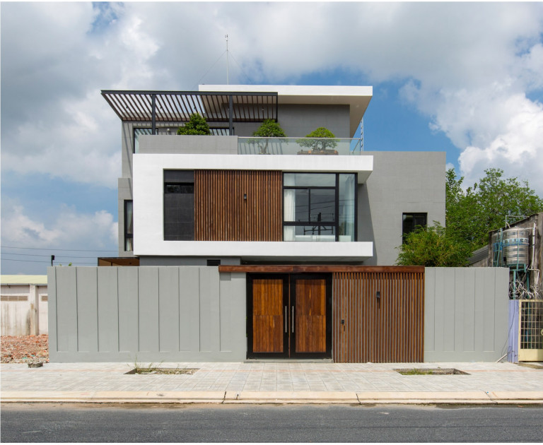 - Các mảng tường chính của mặt đứng đều được ốp gạch màu xám nhẹ thiên về chất liệu bê tông thể hiện xu hướng của sự tối giản nhất.
