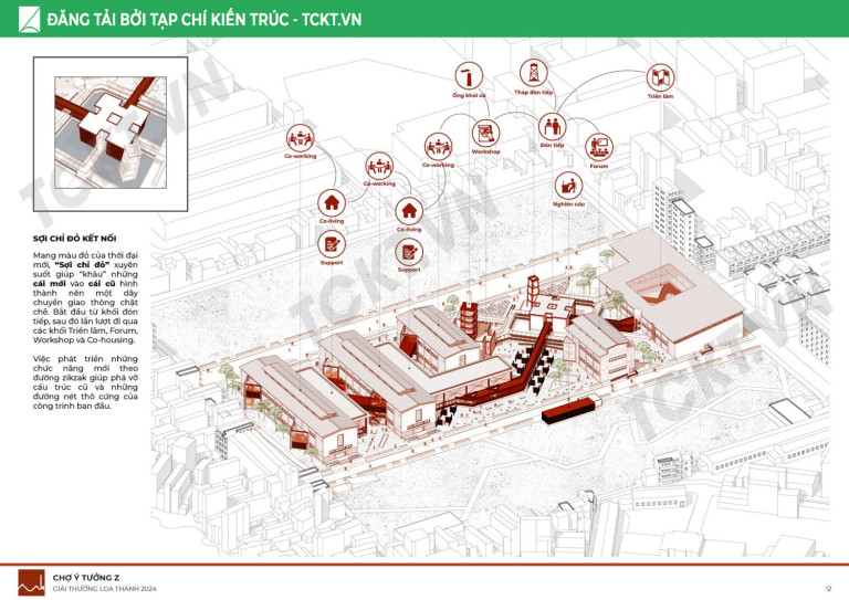 Để đáp ứng nhu cầu của một “chợ ý tưởng” công trình bao gồm các không gian chức năng đặc thù như khối Co-working (không gian làm việc), khối Co-living (không gian ở và sinh hoạt chung), khối Co-play (không gian vui chơi, giải trí, thể thao), khối Co-break (không gian ăn, uống chung). Ngoài ra còn có Khối Triển lãm (nơi trưng bày ý tưởng, trưng bày lịch sử Nhà máy cũ), Khối Forum (nơi tổ chức các diễn đàn, kêu gọi vốn đầu tư) và Khối Workshop.