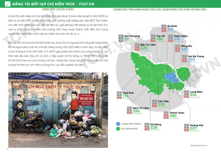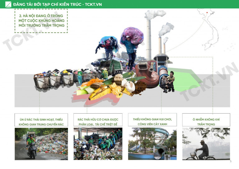 Hà Nội đang ở trong một cuộc khủng hoảng môi trường trầm trọng! Trong khi đó, vấn đề thu gom và xử lý rác thải đang gặp rất nhiều khó khăn khi các khu xử lý rác của Thủ đô bị quá tải. Sự thiếu thốn của các không gian trung chuyển rác với tình trạng người dân chặn xe chở rác vào khu xử lý khiến cho các tuyến phố nội thành đều ngập tràn trong rác thải. Song song với các vấn đề trên là thực trạng “nguồn tài nguyên” rác hữu cơ chưa được tái chế triệt để. Một phần cũng là do thiếu cơ sở hạ tầng, phần còn lại là do ý thức của người dân chưa cao trong việc tạo thói quen phân loại và tái chế rác, gây ra khó khăn trong việc thu gom và xử lý sau này. Cuối cùng tình trạng khủng hoảng môi trường còn thể hiện ở việc thiếu các công viên cây xanh, và khu vui chơi công cộng.