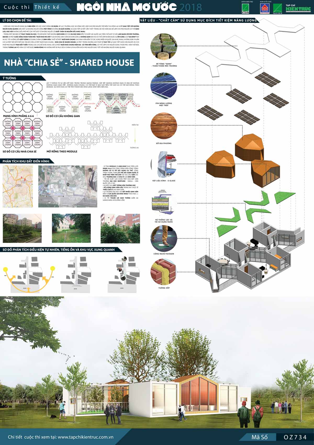 Công trình Share house được lấy ý tưởng từ sự liên kết hóa học dạng mạng phẳng, sắp xếp những không gian ở xen kẽ nhưng không gian giao tiếp/không gian chung, có thể đặt ở mọi nơi trên thế giới và mở rộng theo module, xa hơn nữa có thể trở thành mô hình làng sinh viên hiện đại
