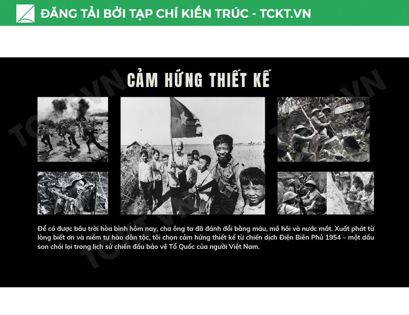 Khi nghe những câu chuyện kể về thời chiến, người thiết kế đã cảm nhận sâu sắc nỗi khổ cực và sự tàn khốc mà chiến tranh để lại. Từ đó hình thành trong lòng một niềm biết ơn sâu sắc đối với thế hệ cha ông – những con người đã hy sinh tuổi trẻ và mạng sống để bảo vệ độc lập, tự do cho Tổ quốc. Chính nguồn cảm xúc ấy đã trở thành động lực để lựa chọn chiến dịch Điện Biên Phủ – một trong những chiến thắng vĩ đại nhất của dân tộc – làm chủ đề cho đồ án tốt nghiệp năm nay.