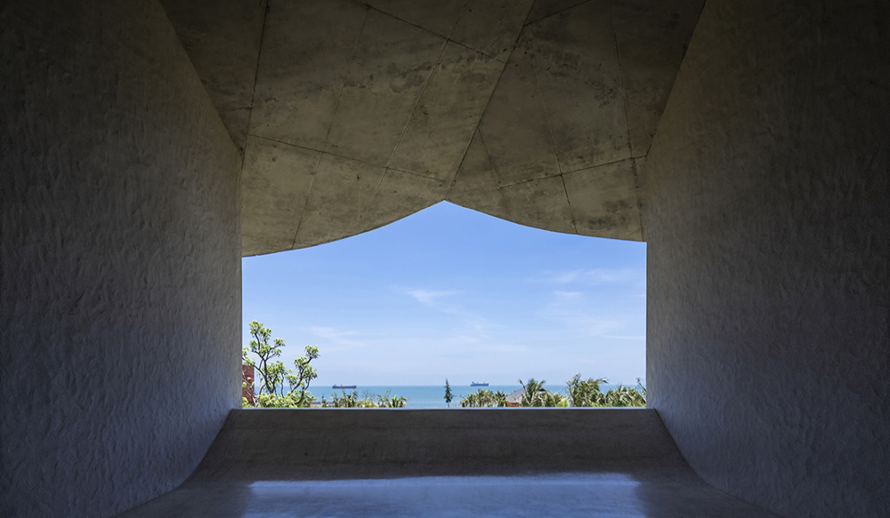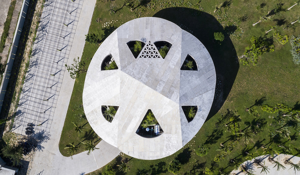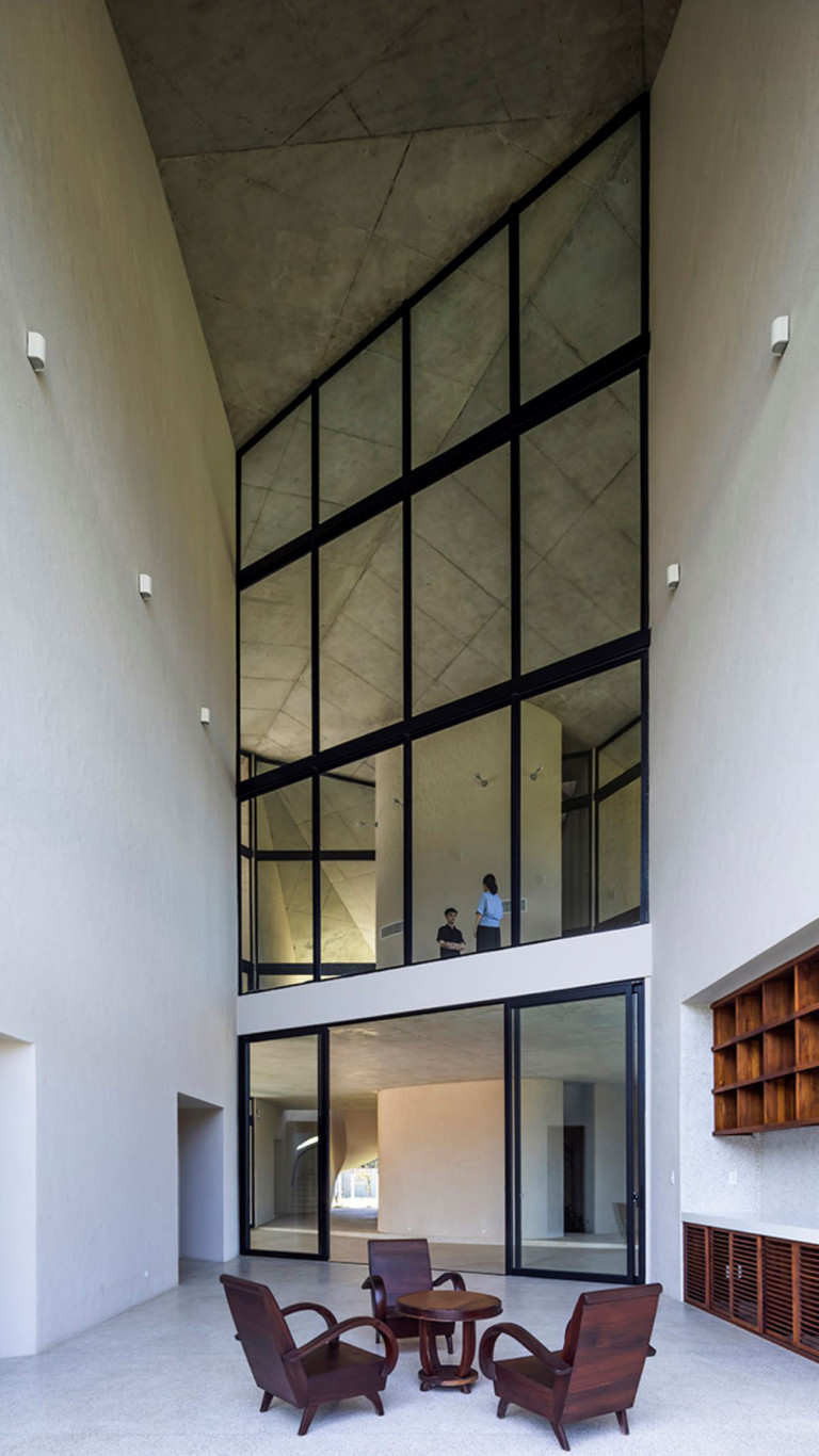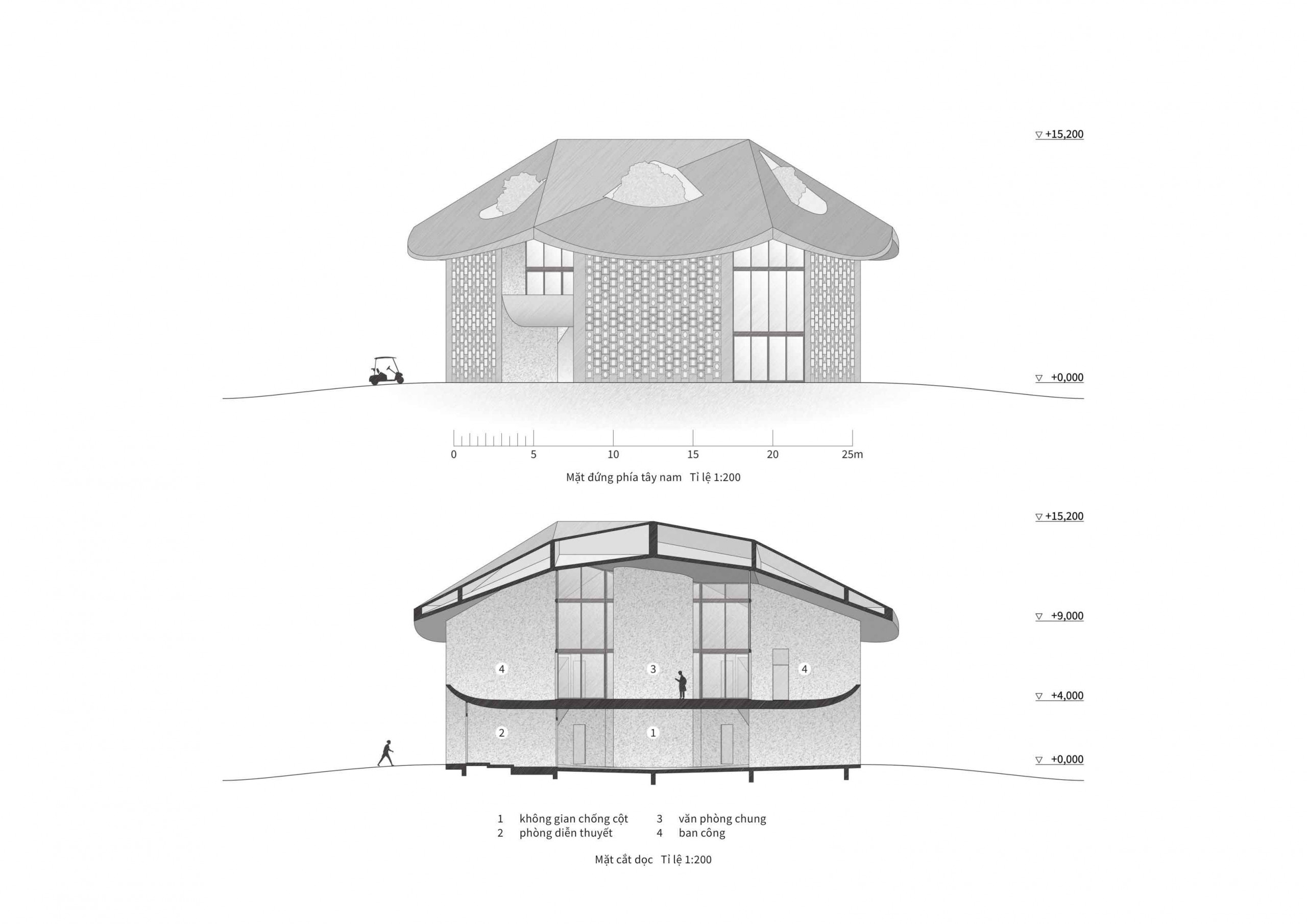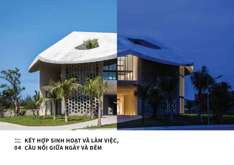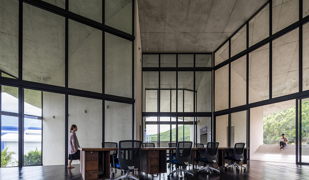 Dưới một mái nhà lớn hình nón giống như chiếc nón lá truyền thống của người nông dân Việt Nam, nhiều chức năng khác nhau được tổ chức bởi bảy khối hình tam giác xác định các không gian chung và không gian riêng. Bên trong các khối chứa những chức năng khép kín như phòng ngủ và văn phòng riêng, đồng thời không gian giữa các khối chứa những chức năng tập trung như văn phòng và phòng lounge chung. Tính chất hang động của không gian giữa cho phép ánh sáng tự nhiên thay đổi liên tục và các điều kiện thông gió xuyên suốt không gian. Các khối thông gió đúc sẵn được thiết kế đặc thù cho bề mặt bên ngoài của các khối hình tam giác, mang lại sự riêng tư cho những căn phòng bên trong. Những khối bê tông cốt sợi thủy tinh này có kích thước lớn hơn thông thường để phù hợp với quy mô hùng vĩ của phông nền cảnh quan xung quanh.