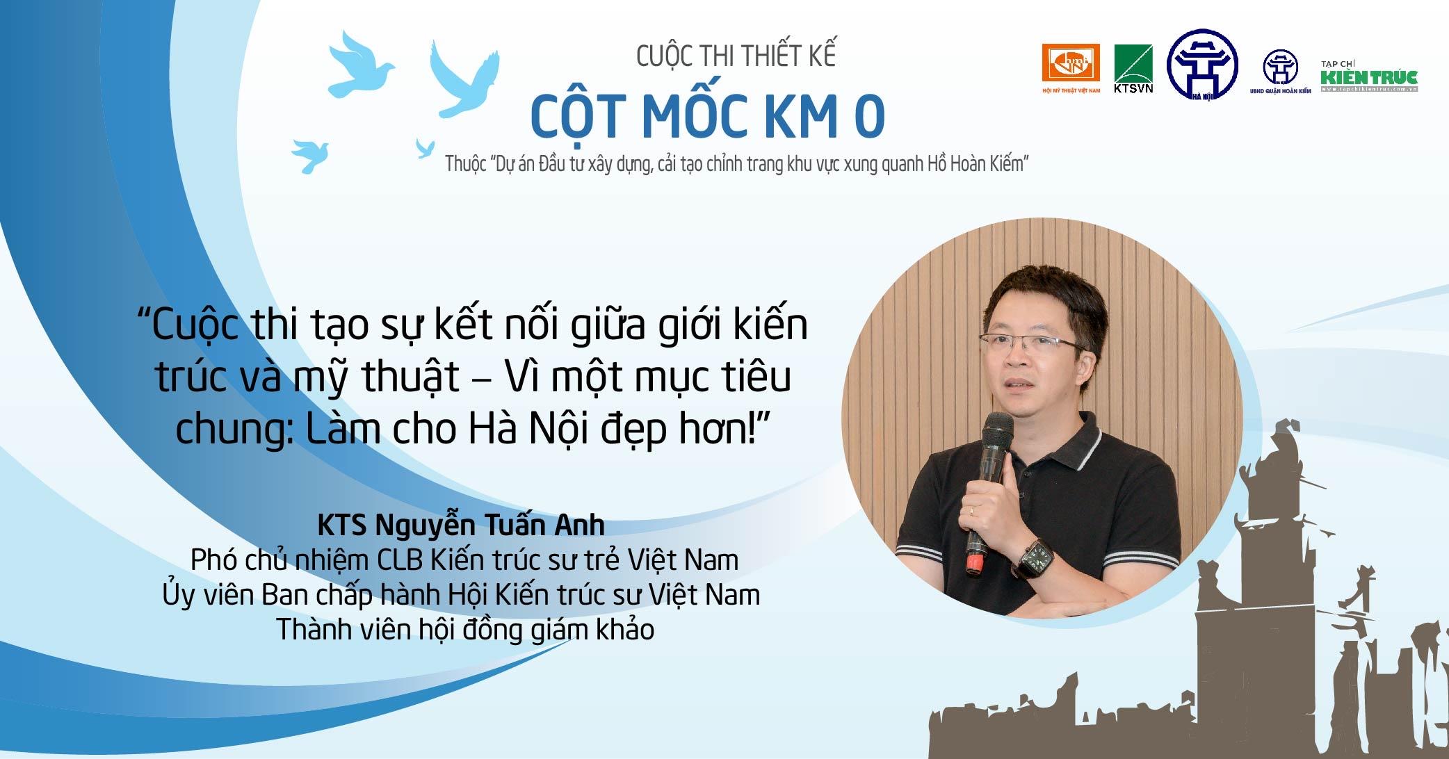 Chia sẻ về Cuộc thi thiết kế Cột mốc Km0, GS.TS.KTS Nguyễn Quốc Thông – Phó chủ tịch Hội Kiến trúc sư Việt Nam – Phó Chủ tịch Hội đồng và KTS Nguyễn Tuấn Anh – Phó chủ nhiệm CLB Kiến trúc sư trẻ Việt Nam, Ủy viên Ban chấp hành Hội Kiến trúc sư Việt Nam – Thành viên hội đồng giám khảo cùng đồng quan điểm: “Thiết kế là sự kết hợp hài hoà giữa kiến trúc và mỹ thuật.”