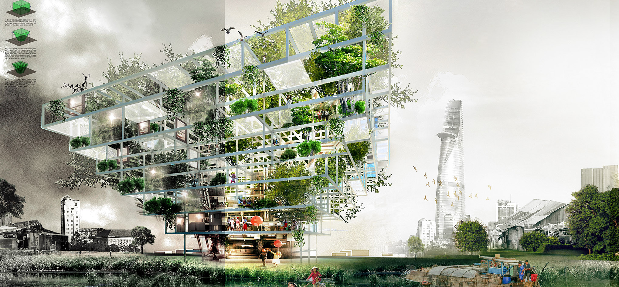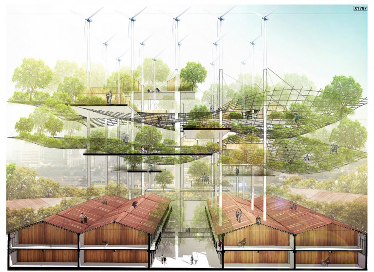 Bạn đọc Nguyễn Tường bình luận về phương án MS12 (Giải Ba): “Bài thi khá ổn. Bài tuy được đưa lên cao để giảm mật độ dân cư và để mảng xanh về thành phố, nhưng vẫn mang lại được những liên kết giữa cộng đồng bởi giải pháp tạo sân trong giữa các khối dân cư_ nơi sinh hoạt cộng đồng. Đem lại được cảm giác như sinh hoat dưới mặt đất dù đang ở trên cao. Tuy nhiên việc liên kết các cây “vị lai” vẫn chưa thỏa mãn vì khoảng cách di chuyển vẫn còn quá xa”.