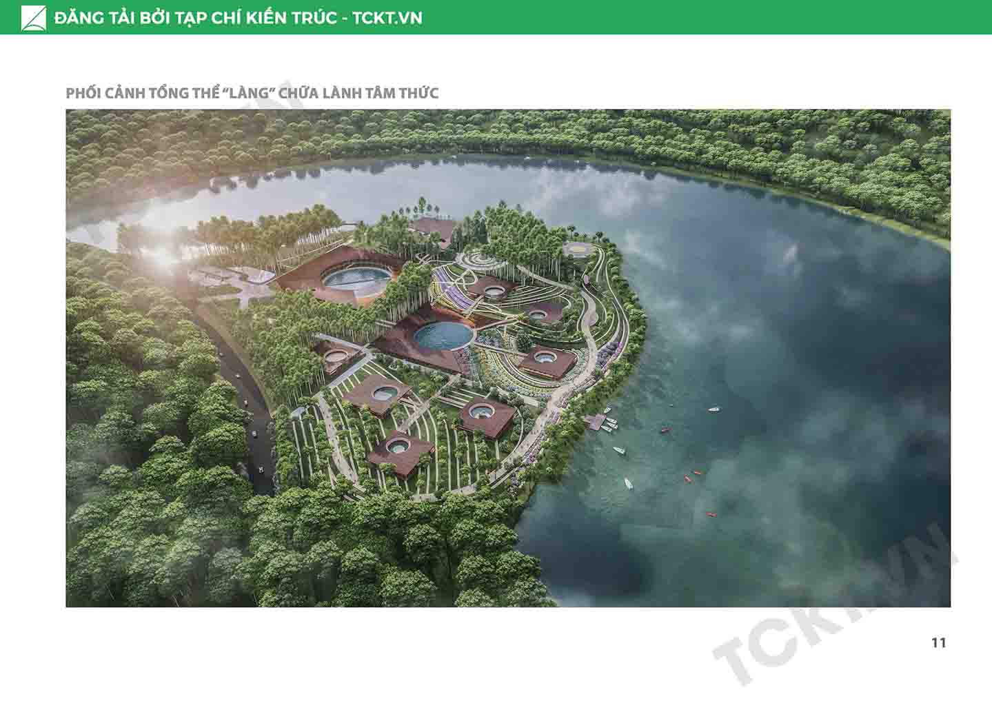 Ý tưởng kiến trúc bắt nguồn từ những hình khối kỷ hà, hình vuông tượng trưng cho thân, hình tròn tượng trưng cho tâm,các góc của hình vuông theo đường nối để tìm về cái mềm mại của hình tròn, thể hiện ý tưởng chính của bài: trở về không – là trở về bên trong tâm thức của con người để tìm về sự bình an. “Làng”chữa lành tâm thức ngoài những công năng chính như lưu trú, thiền, nhận diện tâm lý,…còn có các khu vườn cung cấp thực phẩm cho khu bếp thực dưỡng và những khu vườn giác quan đan xen vào các khu chức năng để tạo điều kiện cho việc phục hồi tinh thần của con người. Các hoạt động thể thao cũng được thêm vào phần công năng chính theo quan niệm“vực dậy thể chất là vực dậy tinh thần”.