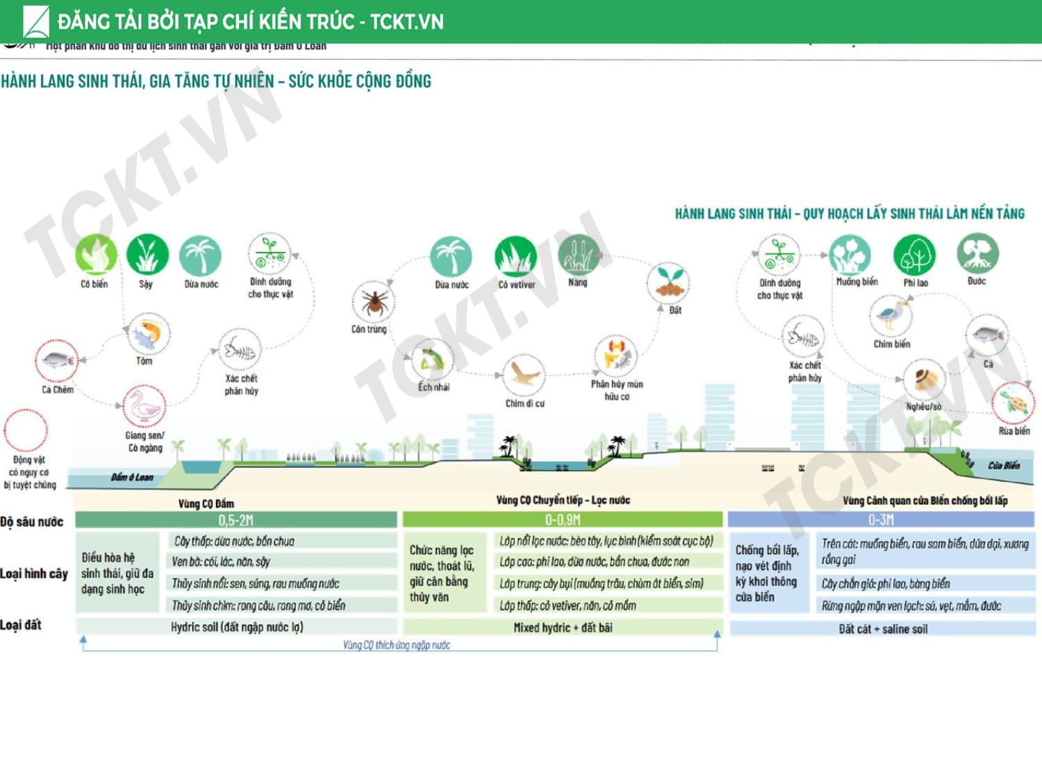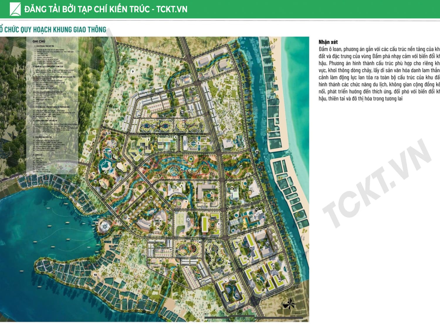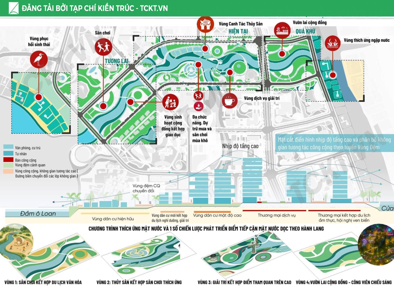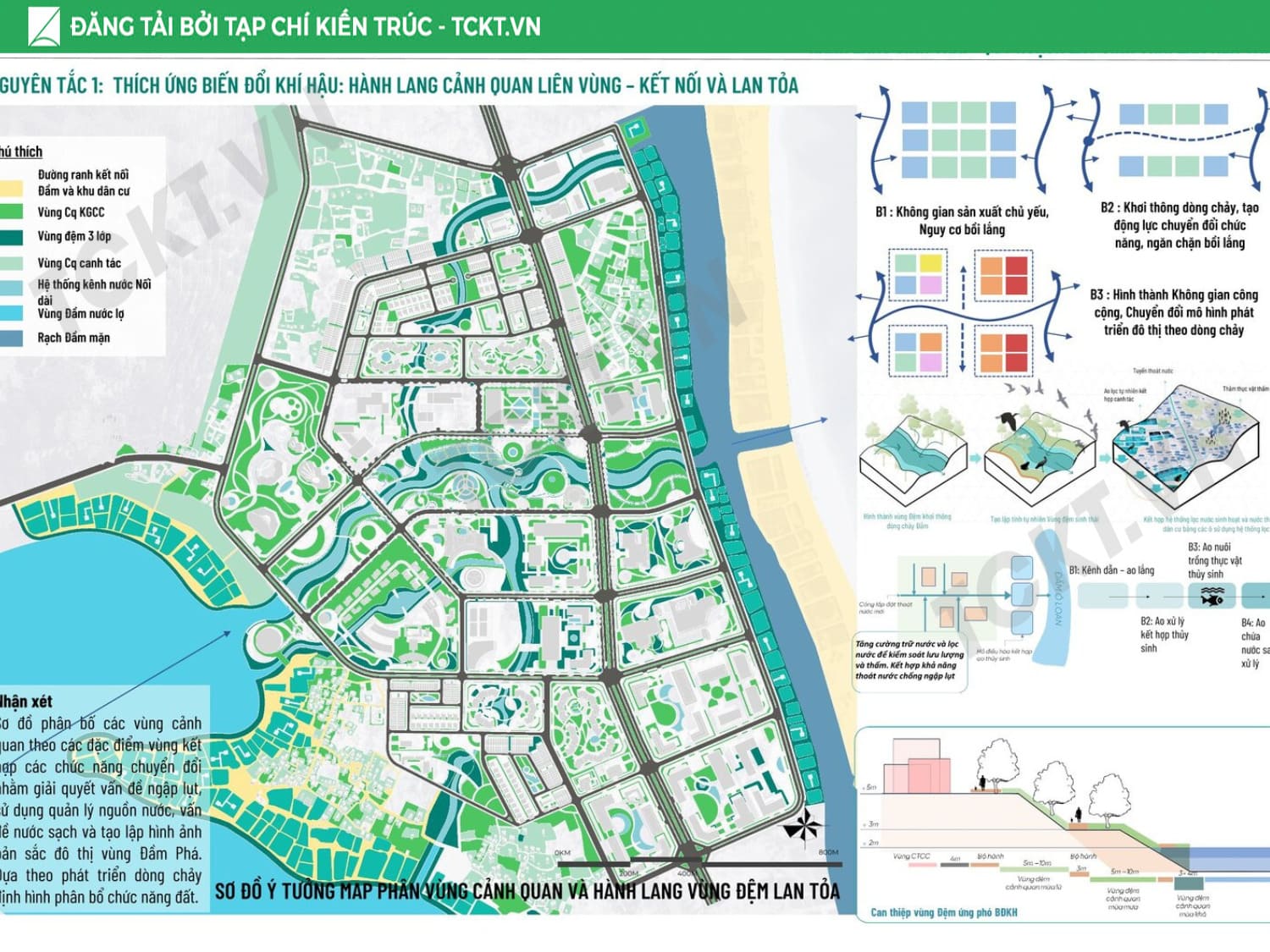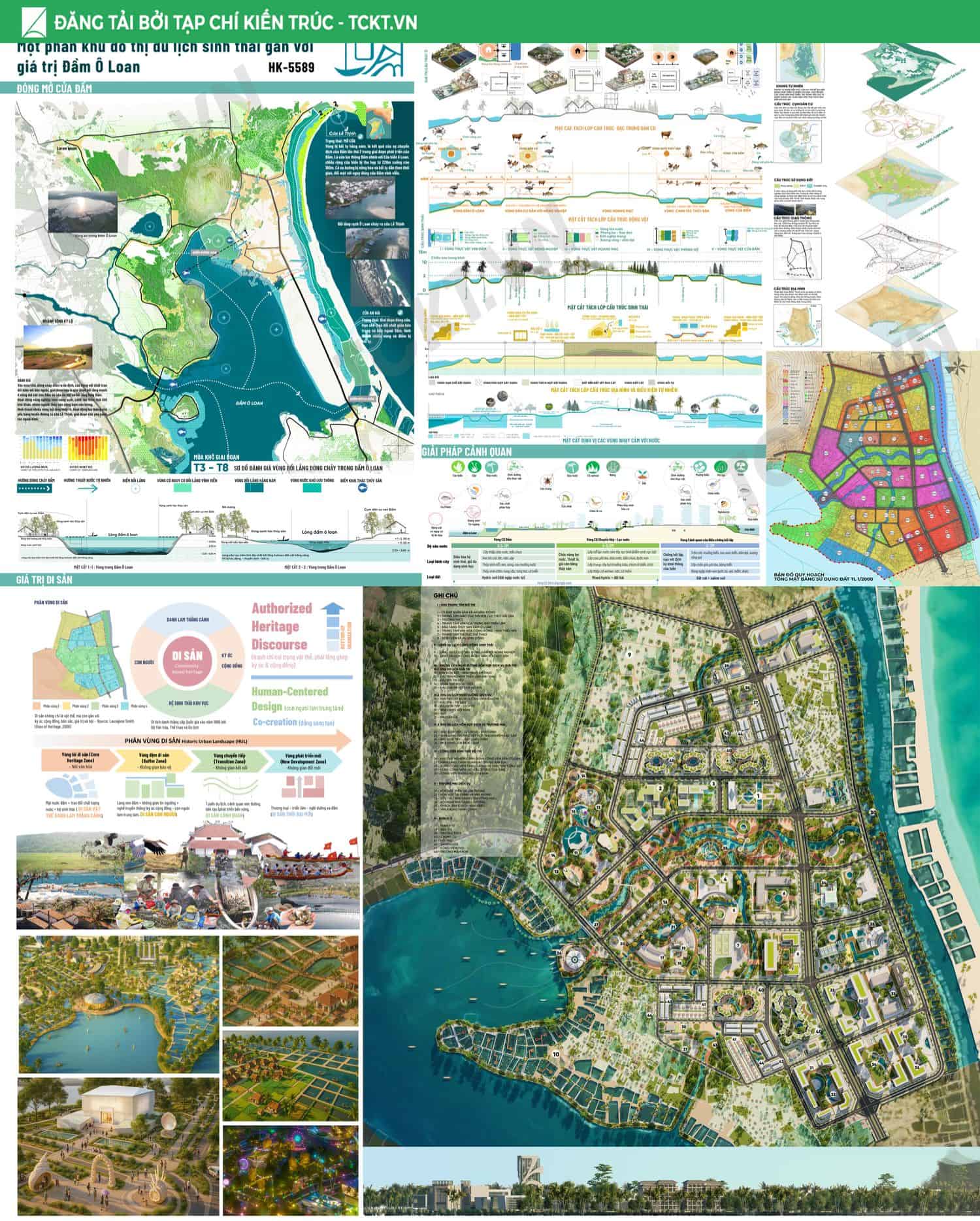 Giải pháp chủ đạo Tổ chức vùng đệm sinh thái – thủy văn liên kết khu vực trong đầm với cửa biển, từng bước khơi thông các luồng nước trọng yếu để giảm thiểu bồi lắng. Phát triển vùng đệm hành lang xanh – không gian mở kết nối toàn khu, hình thành trục đi bộ ven đầm và các điểm ngắm cảnh – bến thuyền phục vụ du lịch. Cấu trúc lại cụm làng sinh thái, nhận diện giá trị văn hóa địa phương và liên kết với sản phẩm du lịch bản địa và du lịch cộng đồng để tôn vinh giá trị bản địa. Chuyển đổi mô hình thủy sản: các ao nuôi tích hợp vườn thủy sinh lọc nước, vừa là hạ tầng môi trường, vừa là không gian trải nghiệm – giáo dục, tạo chuỗi giá trị bền vững cho cộng đồng và đô thị.