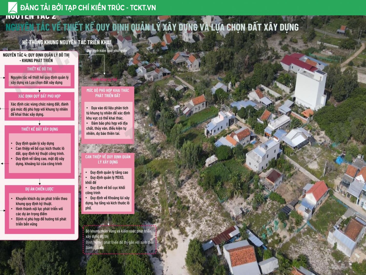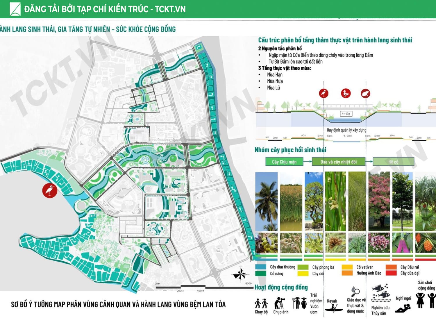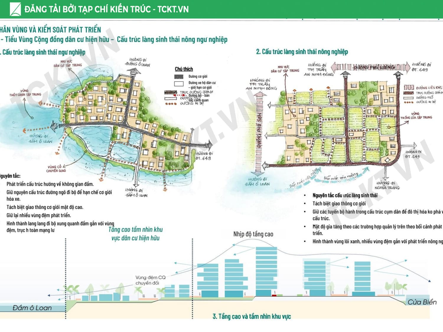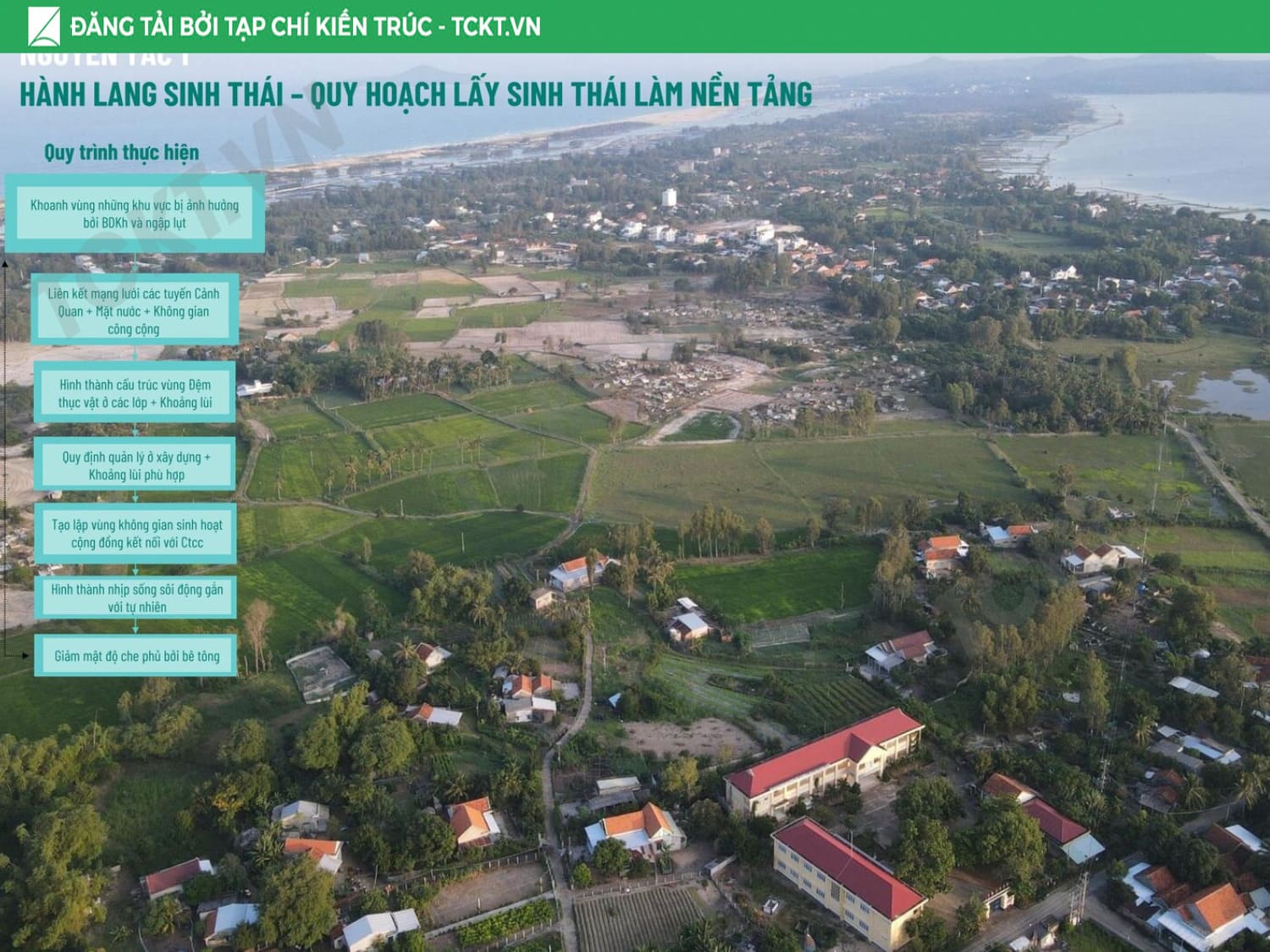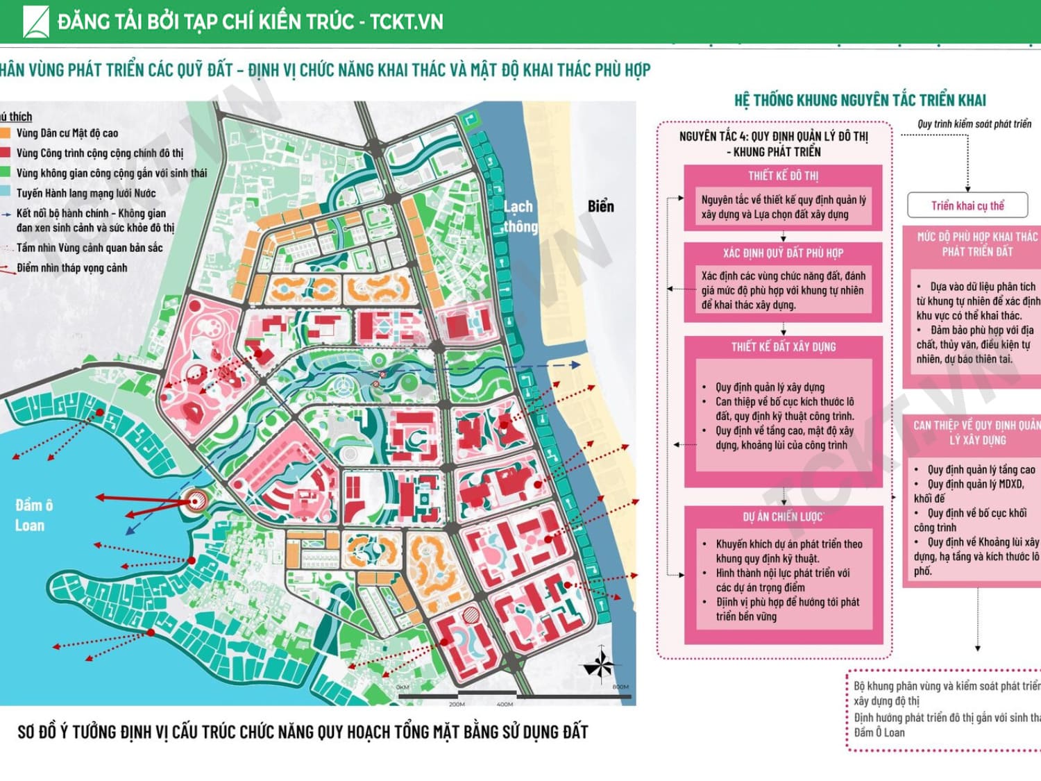 Giải pháp chủ đạo Tổ chức vùng đệm sinh thái – thủy văn liên kết khu vực trong đầm với cửa biển, từng bước khơi thông các luồng nước trọng yếu để giảm thiểu bồi lắng. Phát triển vùng đệm hành lang xanh – không gian mở kết nối toàn khu, hình thành trục đi bộ ven đầm và các điểm ngắm cảnh – bến thuyền phục vụ du lịch. Cấu trúc lại cụm làng sinh thái, nhận diện giá trị văn hóa địa phương và liên kết với sản phẩm du lịch bản địa và du lịch cộng đồng để tôn vinh giá trị bản địa. Chuyển đổi mô hình thủy sản: các ao nuôi tích hợp vườn thủy sinh lọc nước, vừa là hạ tầng môi trường, vừa là không gian trải nghiệm – giáo dục, tạo chuỗi giá trị bền vững cho cộng đồng và đô thị.