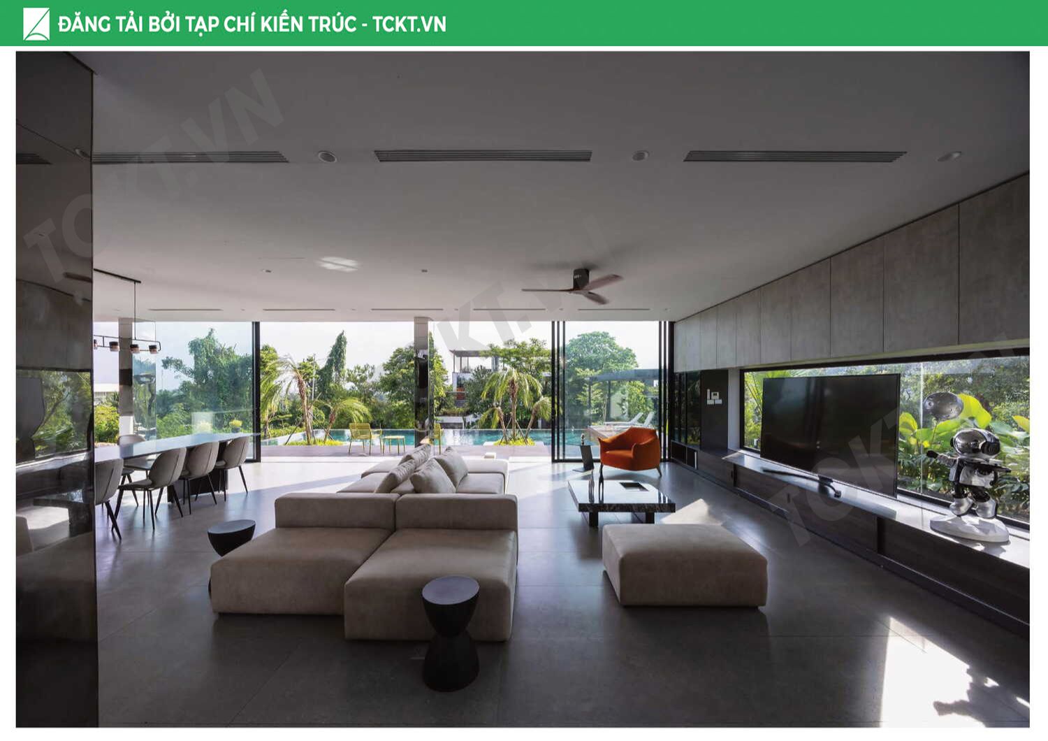 Không gian phòng khách và bếp mở rộng ra ngoài, kết nối trực tiếp với bể bơi và sân vườn, mang đến một trải nghiệm sống liền mạch, nơi các khu vực trong nhà luôn giao thoa với thiên nhiên. Mỗi góc nhỏ của căn villa này đều được thiết kế để khơi gợi cảm giác tự do, thư giãn và tối đa hóa sự kết nối giữa con người và môi trường xung quanh.