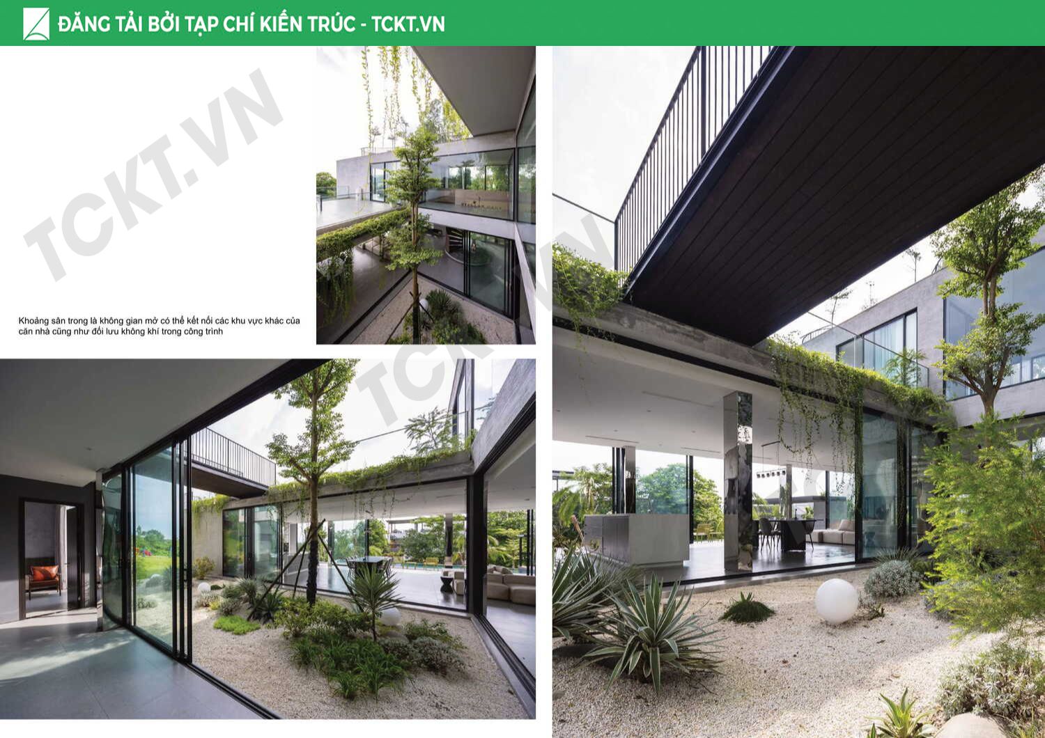 Những khối nhà này không chỉ đơn giản là các không gian sống mà còn góp phần tạo nên một nhịp điệu kiến trúc hấp dẫn cho công trình. Giữa các khối nhà là những khoảng sân vườn và lối đi mở, liên kết với nhau một cách tự nhiên, tạo ra các khu vực xanh liên tục xuyên suốt căn villa. Các sân vườn này không chỉ mang đến sự tươi mới mà còn làm tăng tính mở của không gian, khiến cho mỗi phần của ngôi nhà đều hòa nhập một cách hoàn hảo với cảnh quan xung quanh.