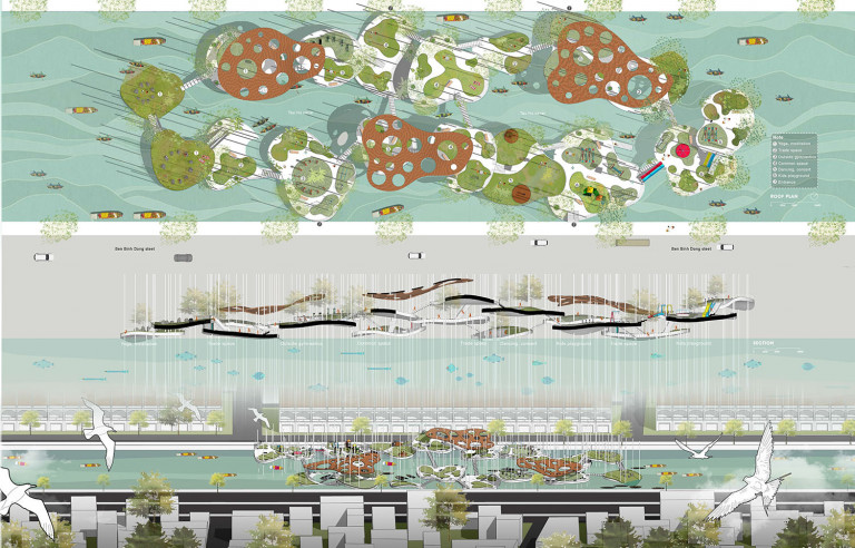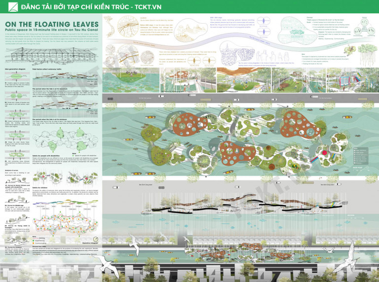 Phương án có tên gọi “Trên những chiếc lá trôi” lấy bối cảnh Kênh Tàu Hủ – nơi chứa đựng nhiều giá trị văn hóa lâu đời, lưu giữ không ít ký ức đẹp về Sài Gòn xưa. Bến Bình Đông được xây dựng vào thế kỷ 19 sau khi nhiều người Hoa đến sinh sống, đây từng là nơi buôn bán sầm uất nhất Sài Gòn, là vựa lúa lớn nhất Nam Bộ. Có nhiều trang sử đã mô tả cảnh hàng trăm con thuyền chở gạo, hàng hóa từ miền Tây vào Sài Gòn buôn bán. Dân cư hai bên bờ dễ dàng kết nối với nhau thông qua con kênh Tàu Hủ này. Ngày nay, với sự phát triển của công nghệ và giao thông đường bộ, người dân không còn ra ngoài nhiều để đi bộ và giao tiếp với nhau. Kênh Tàu Hủ cũng vì thế mà dần bị lãng quên. Do đó, việc thiết kế một không gian gắn kết cộng đồng là điều vô cùng cần thiết.