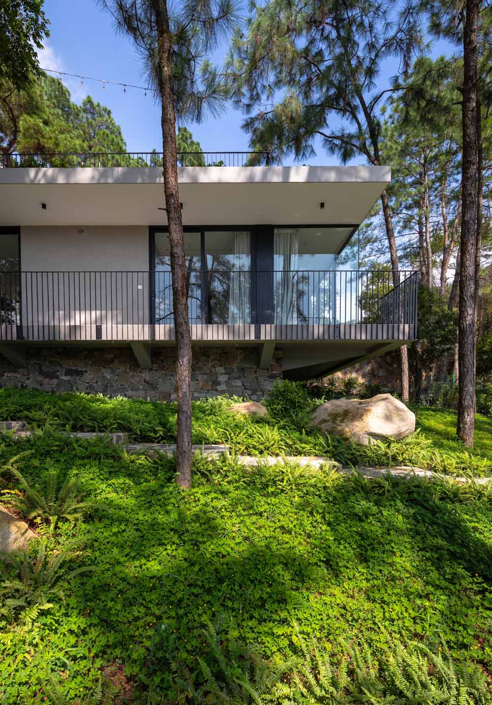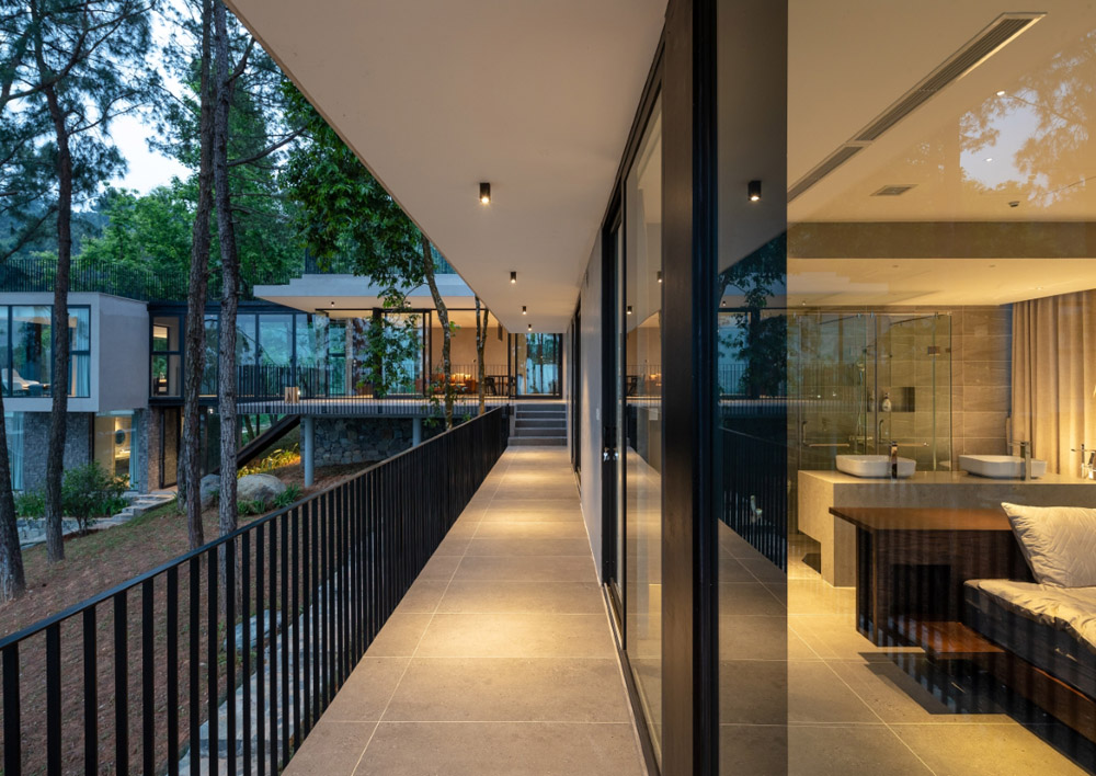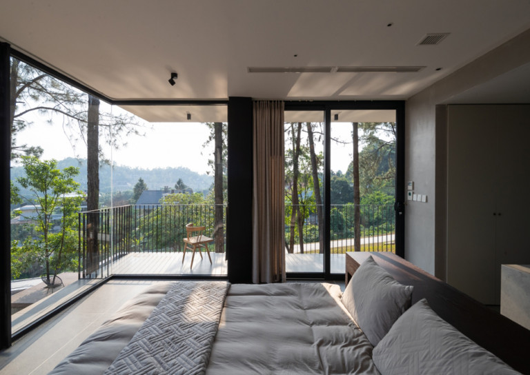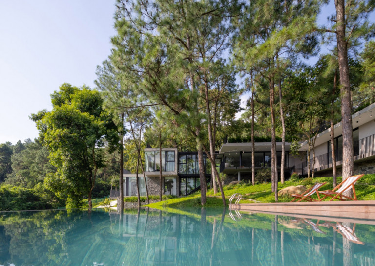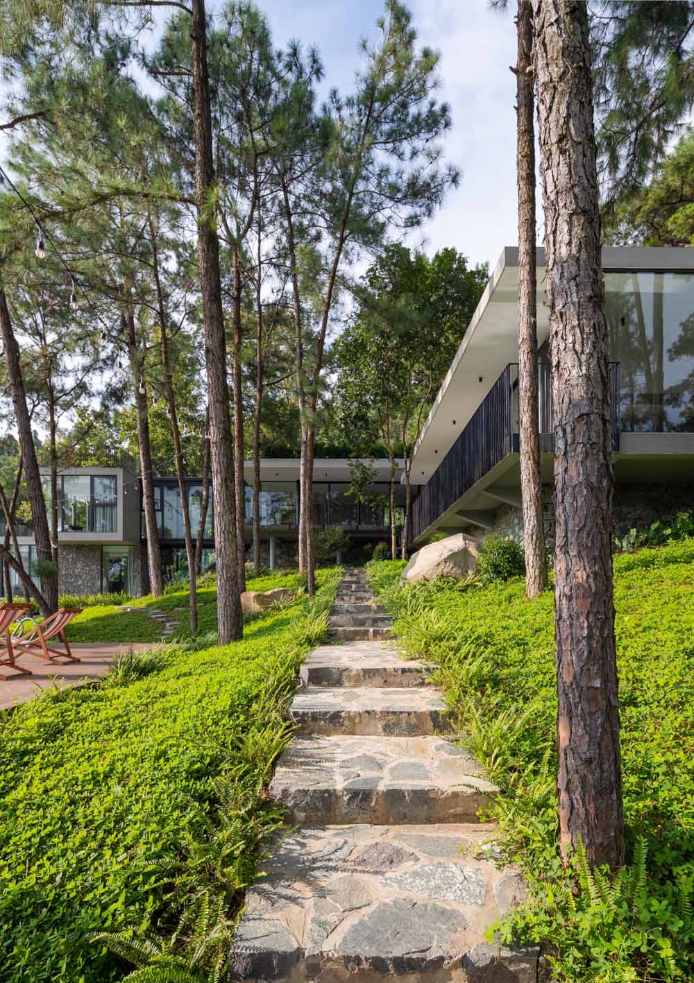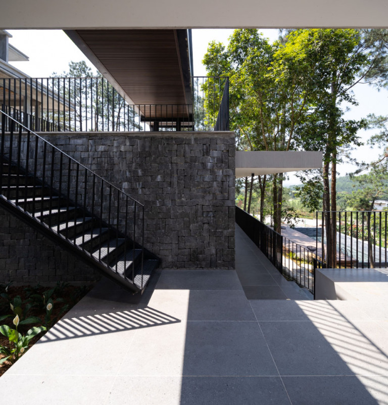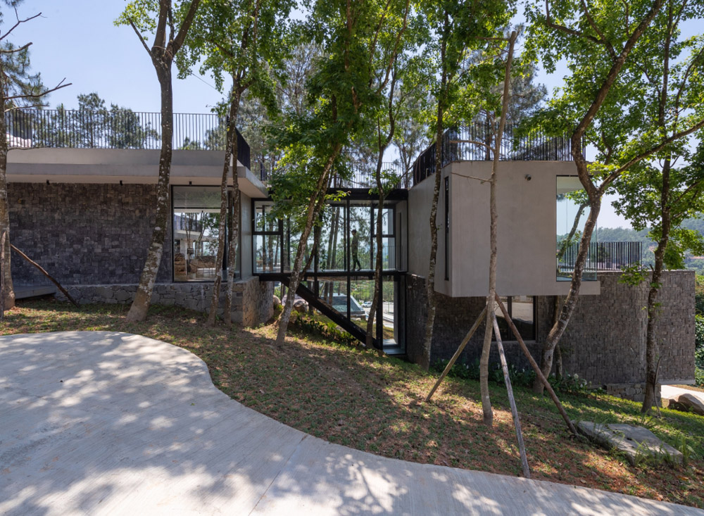 Tam Đảo ReTreat, đúng theo tên gọi thì đây là chốn an trú của một gia đình 3 thế hệ. Mảnh đất này được giữ gìn suốt hơn 10 năm, toàn bộ 52 cây lớn, trong khuôn viên đất hiện trạng được bảo tồn, bao quanh bởi hệ tường rào sơn xanh chắc chắn. Nhìn từ xa, công trình mang tới cảm giác như một khối đá đã tồn tại lâu năm, diện tích xây dựng căn biệt thự bên trong khu đất cũng khá khiêm tốn (chỉ 1/10 diện tích khu đất ), chừng đó theo kiến trúc sư và chủ đầu tư là đủ để cả gia đình sinh sống hài hòa với thiên nhiên.