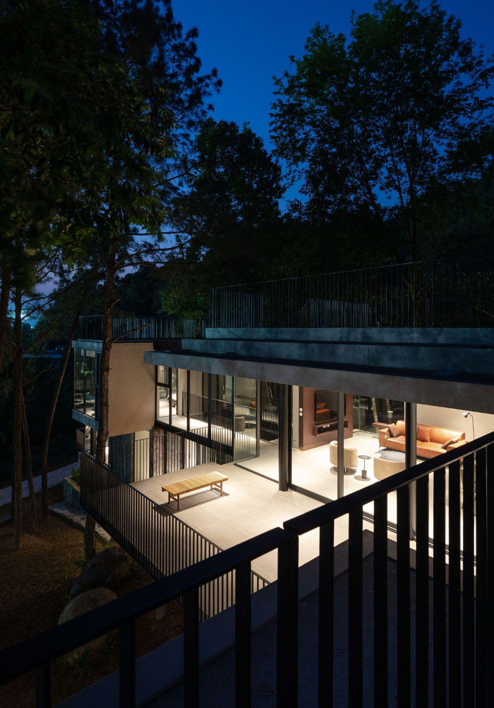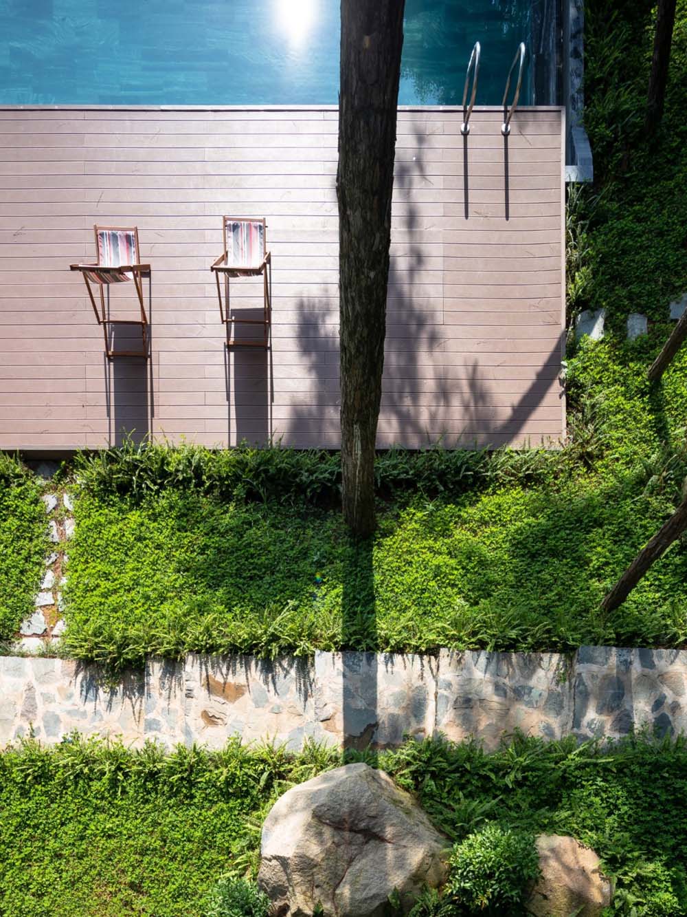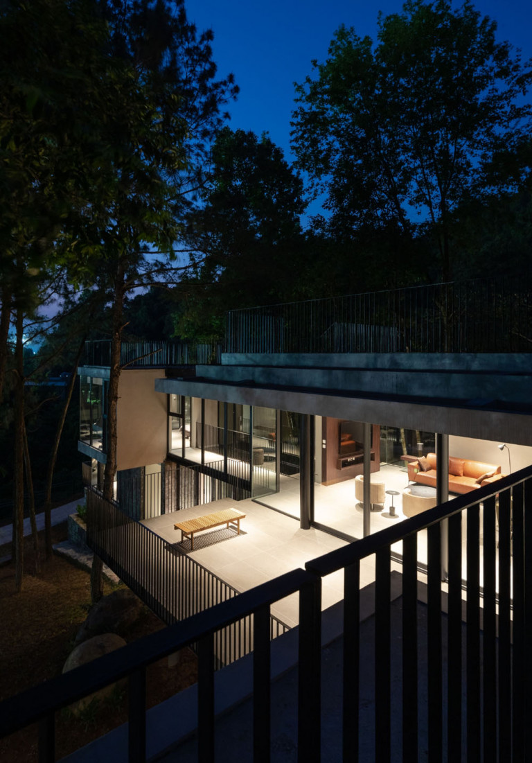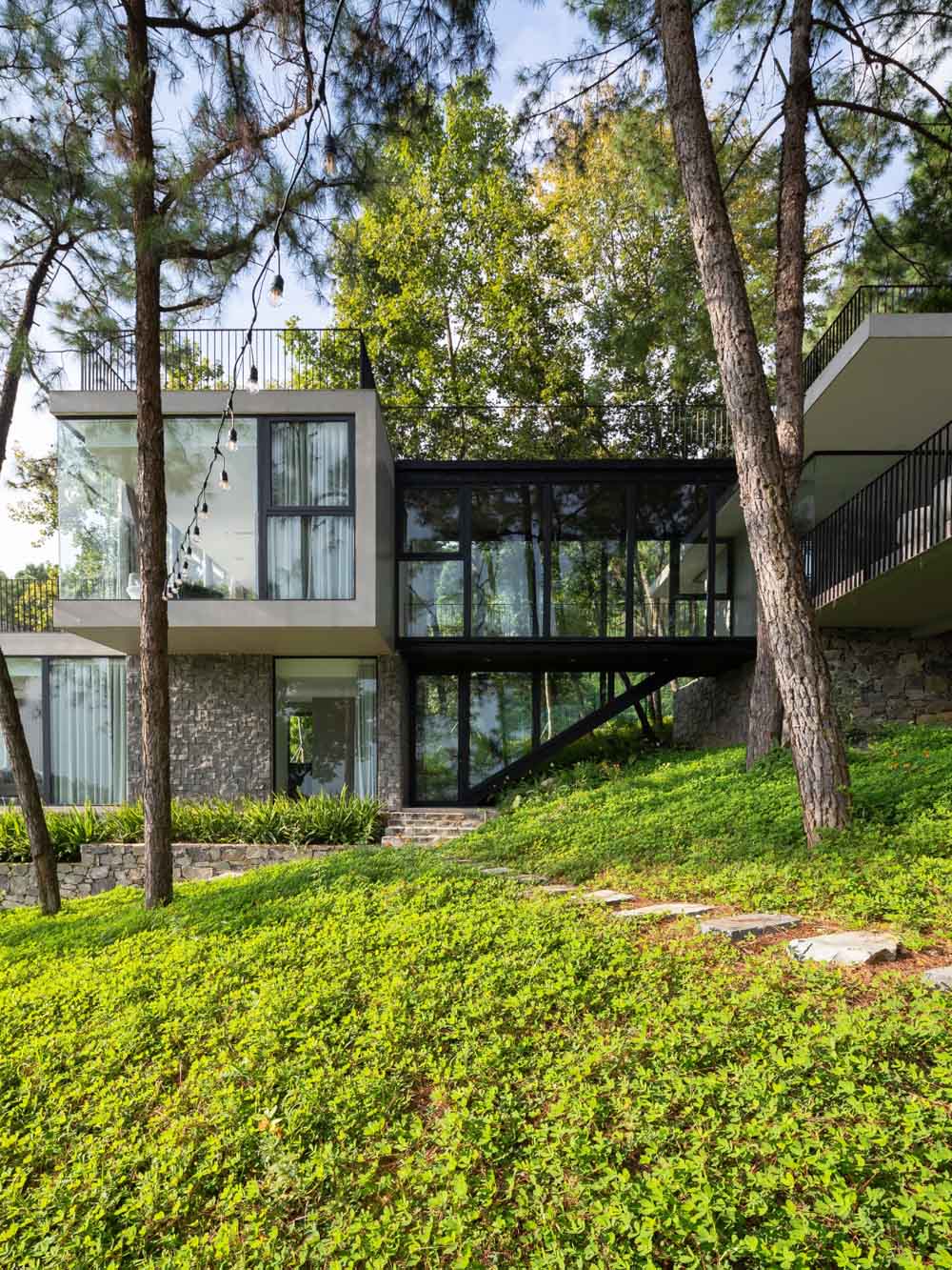 Tam Đảo ReTreat, đúng theo tên gọi thì đây là chốn an trú của một gia đình 3 thế hệ. Mảnh đất này được giữ gìn suốt hơn 10 năm, toàn bộ 52 cây lớn, trong khuôn viên đất hiện trạng được bảo tồn, bao quanh bởi hệ tường rào sơn xanh chắc chắn. Nhìn từ xa, công trình mang tới cảm giác như một khối đá đã tồn tại lâu năm, diện tích xây dựng căn biệt thự bên trong khu đất cũng khá khiêm tốn (chỉ 1/10 diện tích khu đất ), chừng đó theo kiến trúc sư và chủ đầu tư là đủ để cả gia đình sinh sống hài hòa với thiên nhiên.