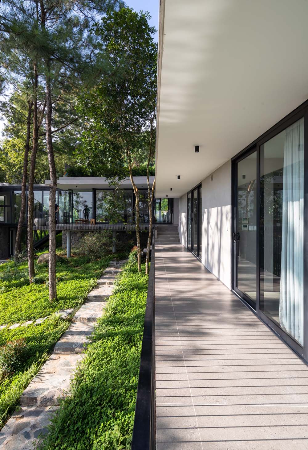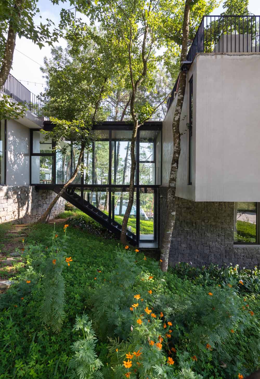 Các khối nhà được nối bằng nhà cầu khiến không gian vườn không bị ngắt quãng, thực vật vẫn sinh trưởng xen kẽ được. Ngoài ra không bị cản gió lưu thông trong công trình.