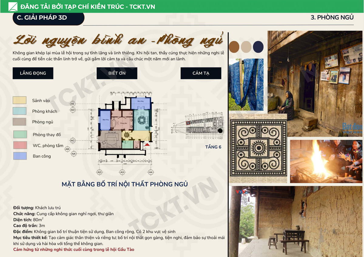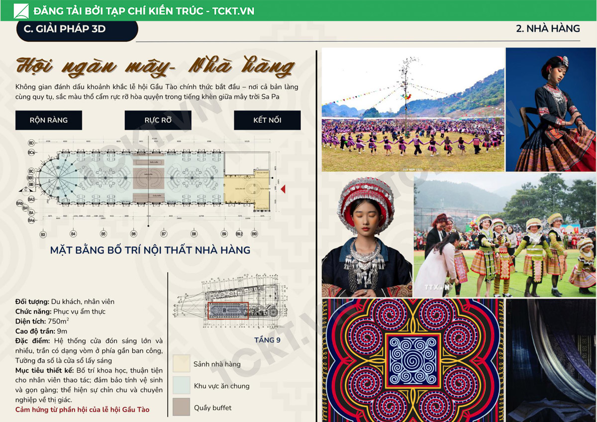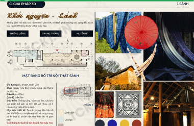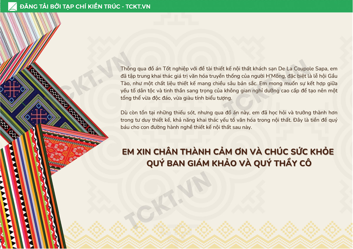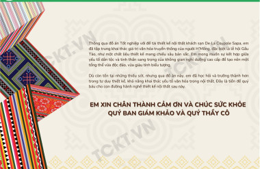 Đề tài “Thiết kế nội thất khách sạn De La Coupole Sapa – Sắc hội giữa mây ngàn” khai thác cảm hứng từ lễ hội Gầu Tào của người H’Mông – nơi hội tụ di sản văn hóa, kiến trúc, tín ngưỡng và nghệ thuật trang trí đặc sắc. Ý tưởng thiết kế tập trung tái hiện không khí lễ hội truyền thống thông qua ngôn ngữ nội thất, với màu sắc, hoa văn và chất liệu mang đậm bản sắc H’Mông, nhằm đem đến trải nghiệm khác biệt và giàu cảm xúc.