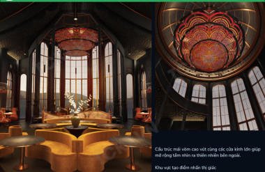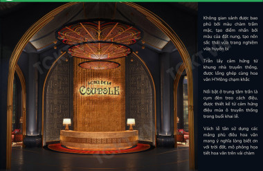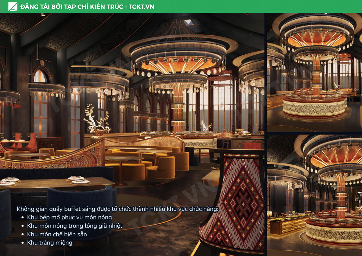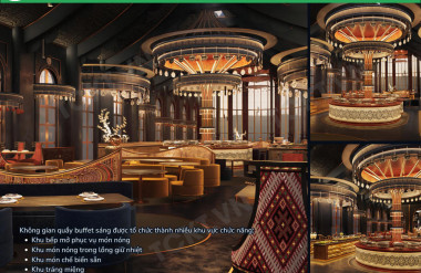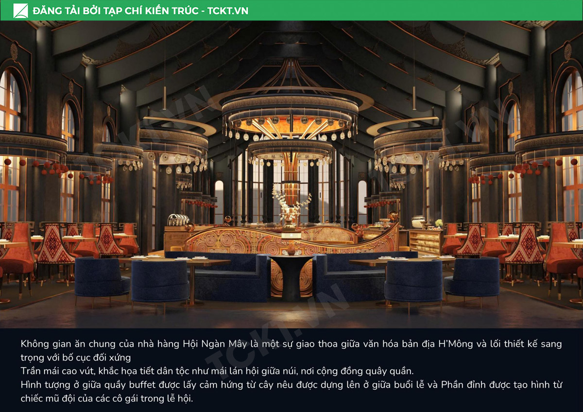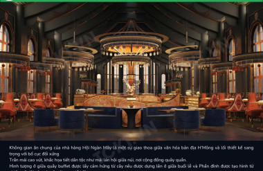 Nhà hàng “Hội ngàn mây” (750m²): Mô phỏng thời điểm bắt đầu phần hội với mái cao, bố cục đối xứng. Quầy buffet trung tâm lấy cảm hứng từ cây nêu và mũ đội truyền thống, kết hợp họa tiết thổ cẩm rực rỡ, mang đến sắc thái sống động và lễ hội.