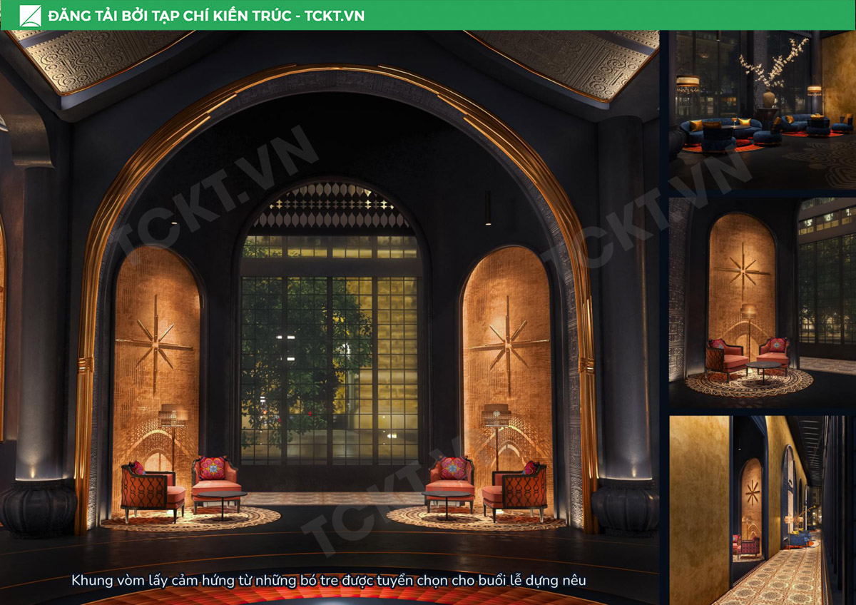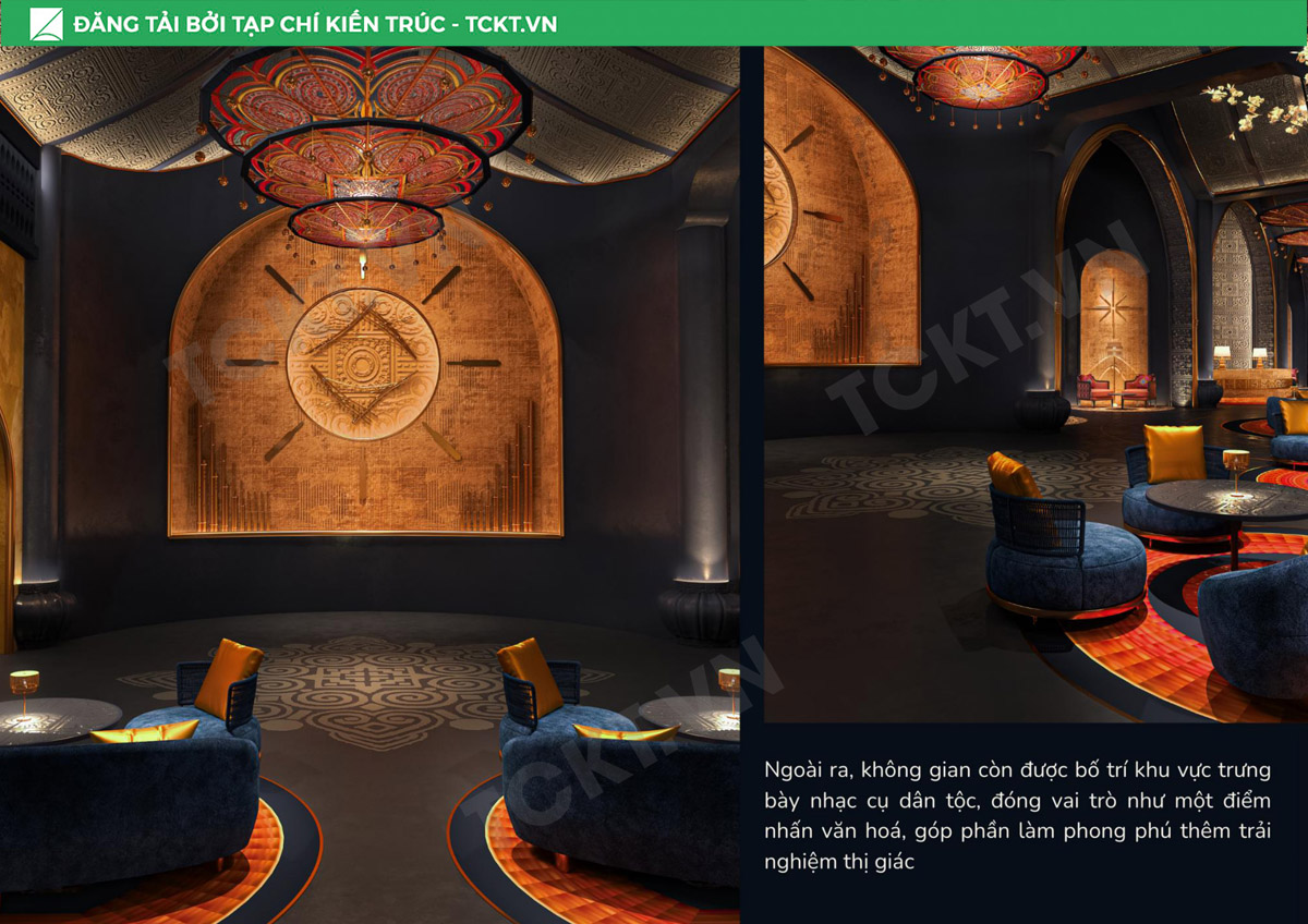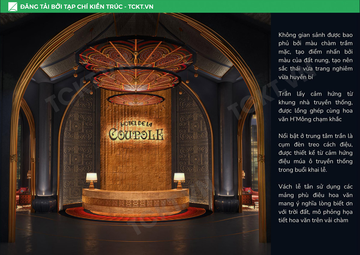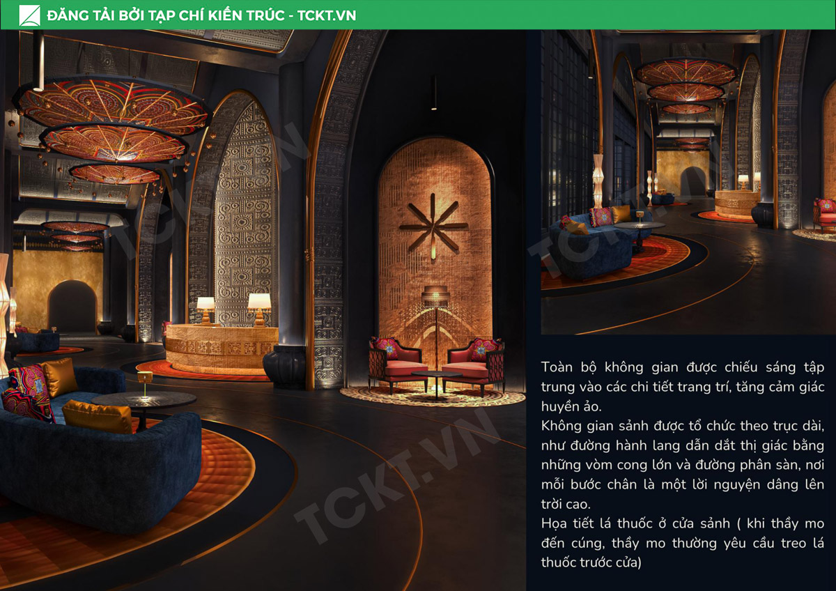 Sảnh “Khởi nguyện” (450m²): Lấy cảm hứng từ khoảnh khắc mở đầu lễ hội tại nhà gia chủ. Gam màu chàm và đất nung kết hợp vòm cong, phù điêu hoa văn, ánh sáng vàng ấm cùng cụm đèn treo cách điệu từ điệu múa ô truyền thống, tạo nên bầu không khí trang nghiêm và huyền bí.