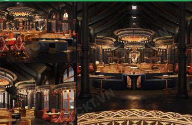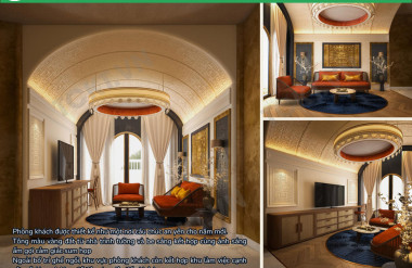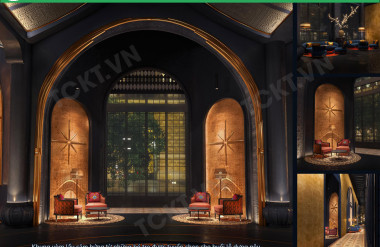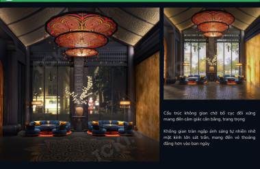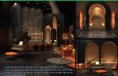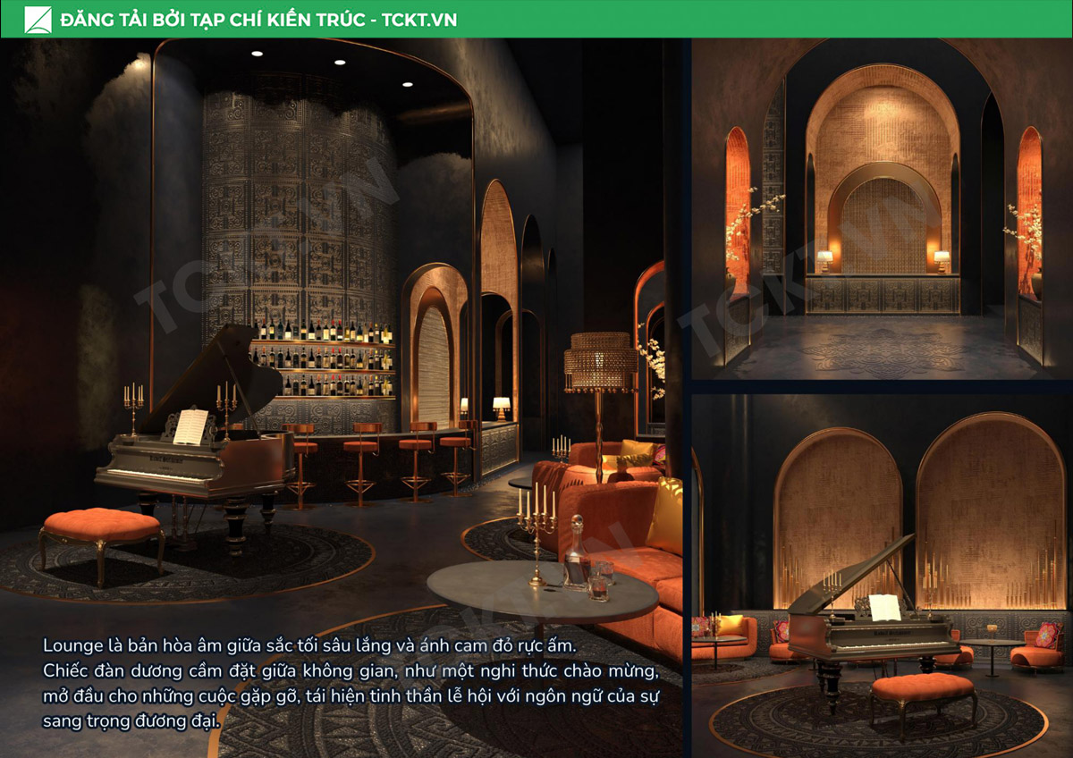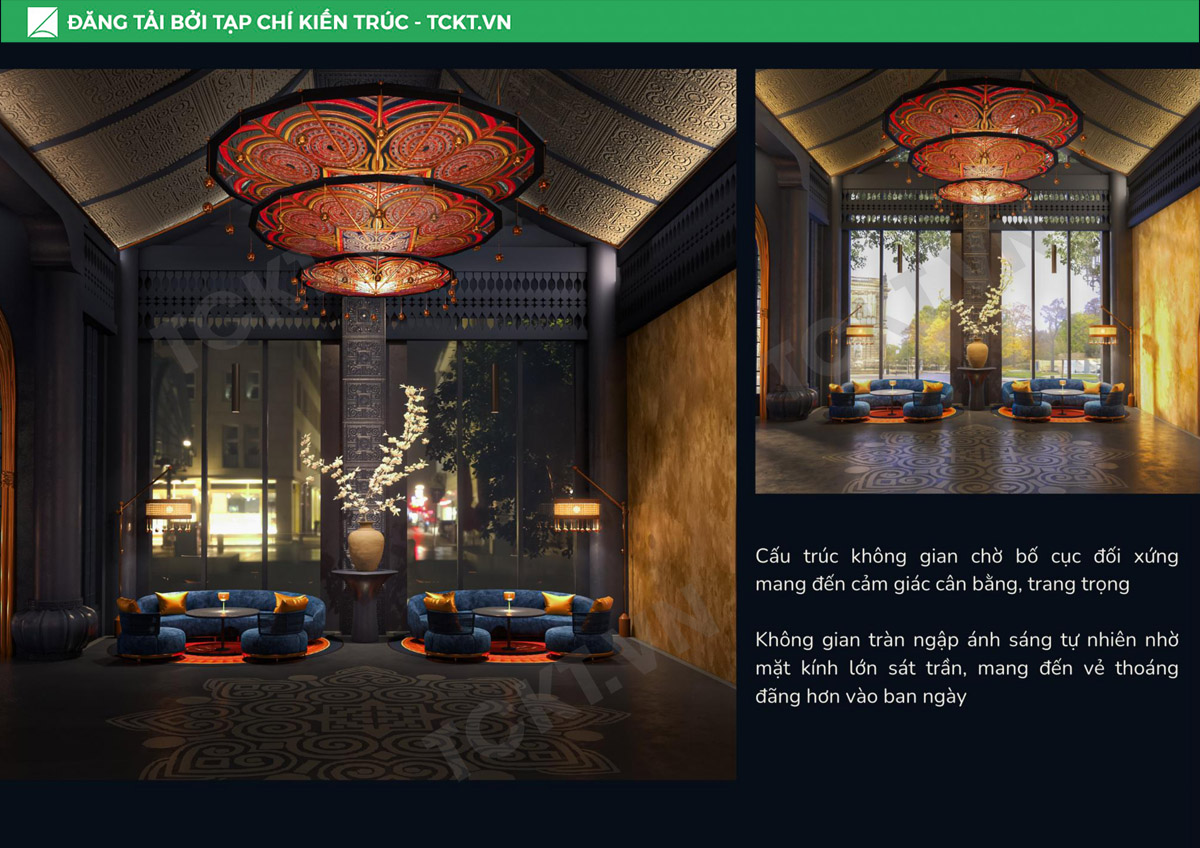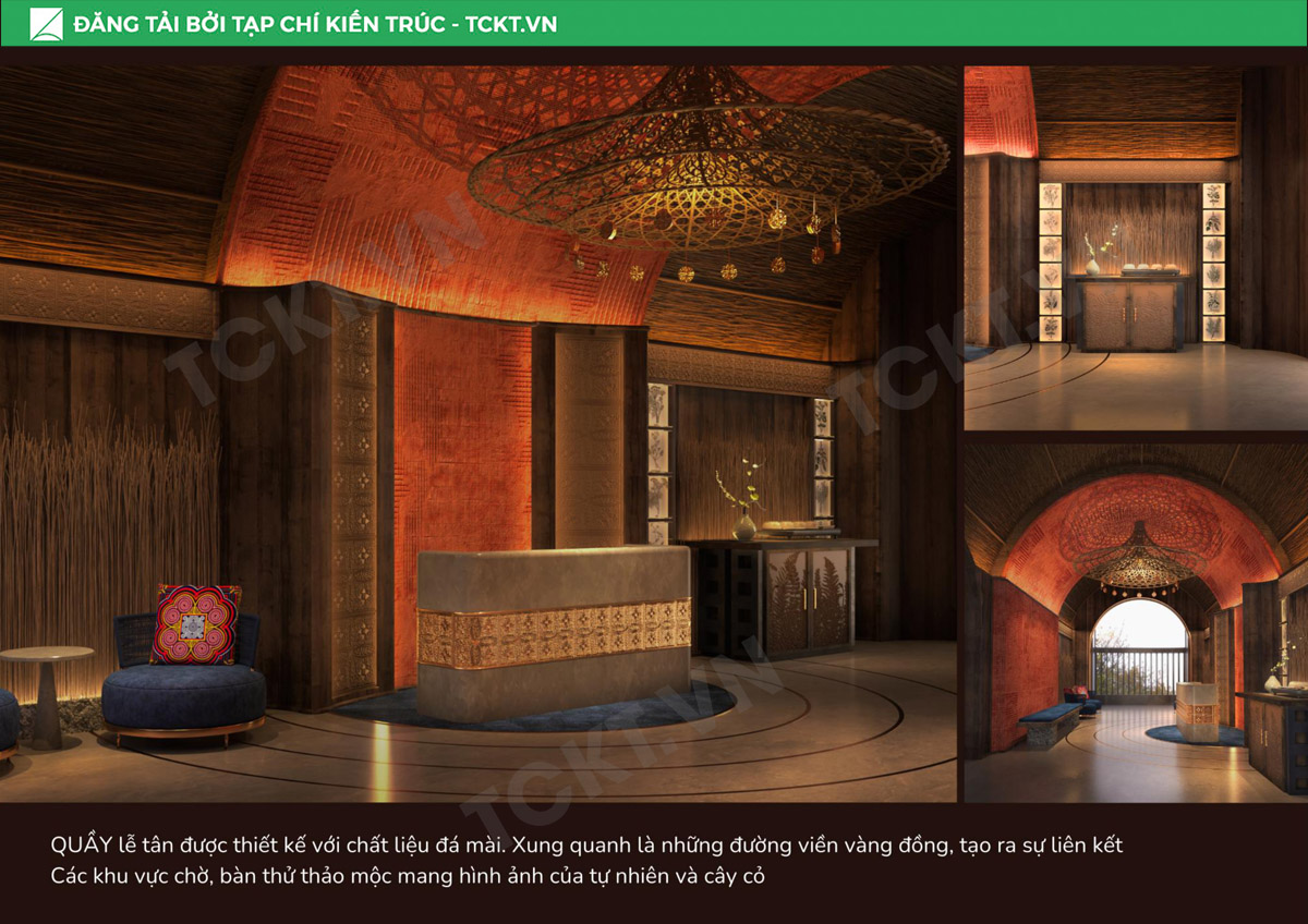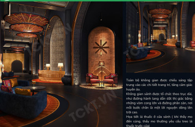 Sảnh “Khởi nguyện” (450m²): Lấy cảm hứng từ khoảnh khắc mở đầu lễ hội tại nhà gia chủ. Gam màu chàm và đất nung kết hợp vòm cong, phù điêu hoa văn, ánh sáng vàng ấm cùng cụm đèn treo cách điệu từ điệu múa ô truyền thống, tạo nên bầu không khí trang nghiêm và huyền bí.